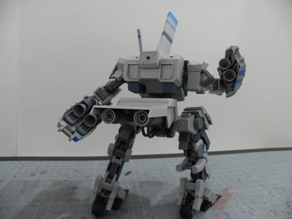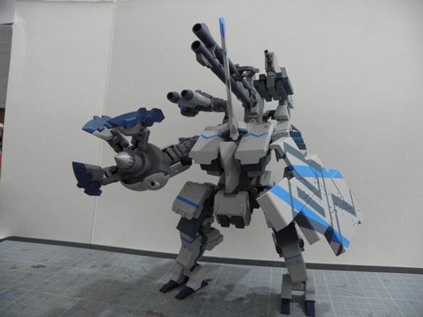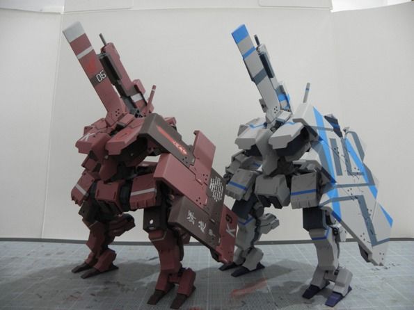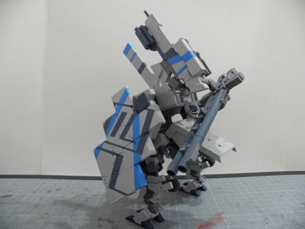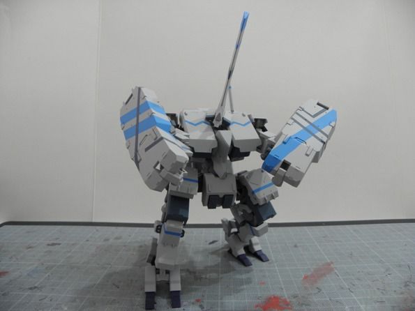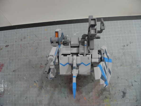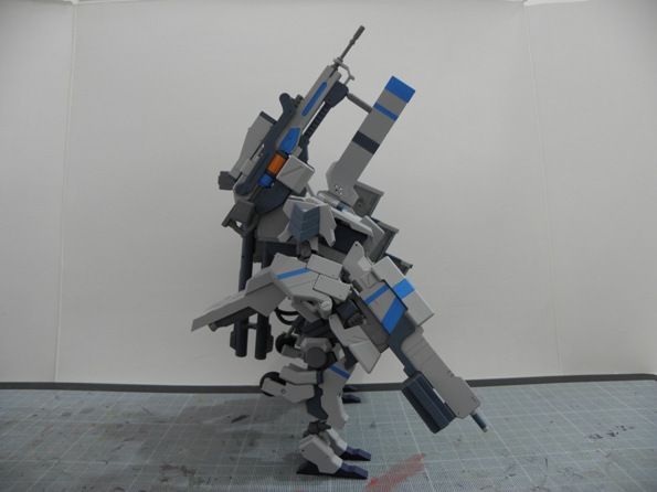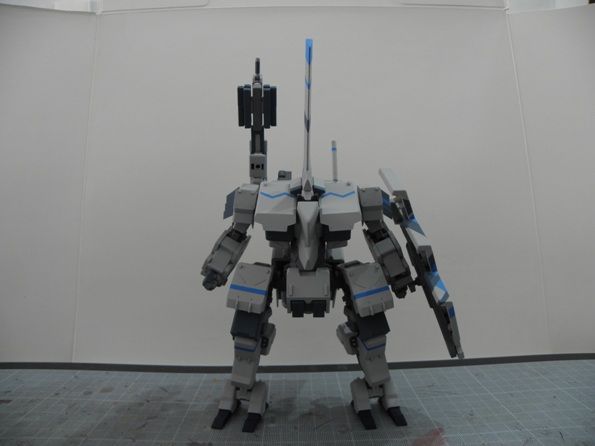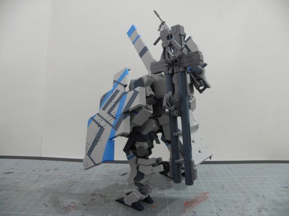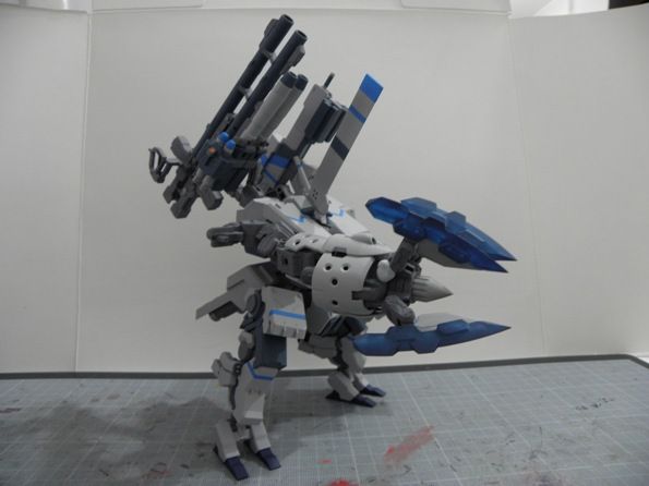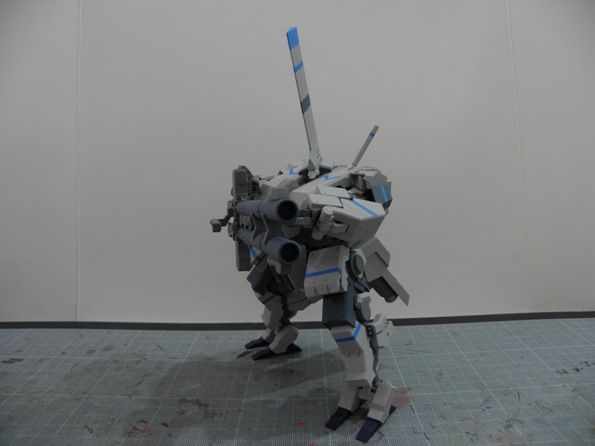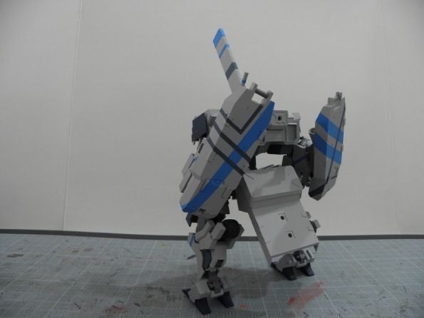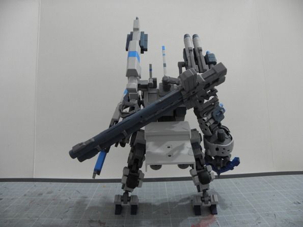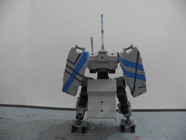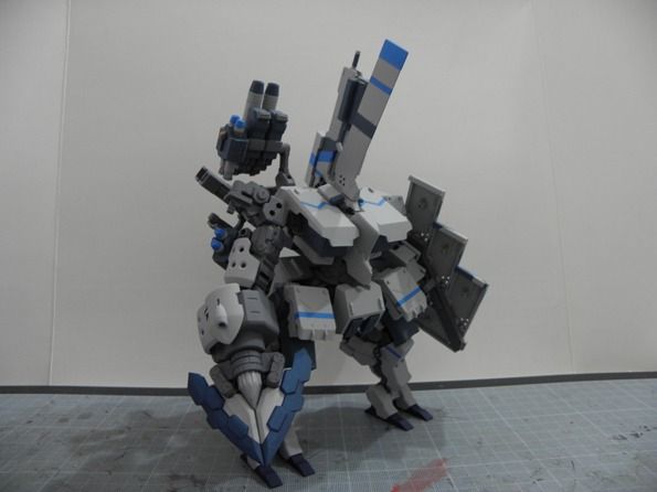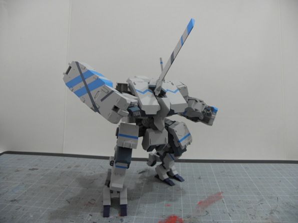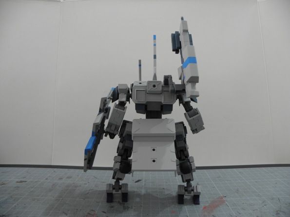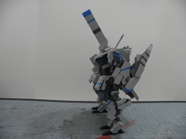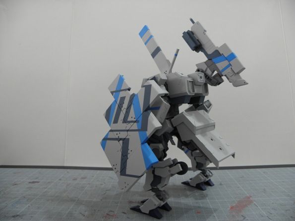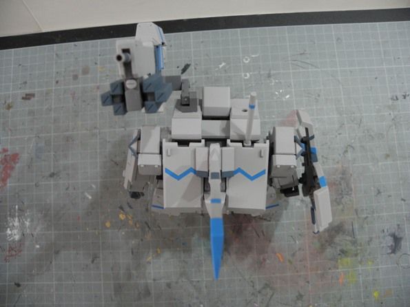 本來我是打算砌隻與上次不同原裝輝鎚出來,剛開始時也只是輕輕地加了支小型加農砲在背部。但可能是ZOIDS砌多了,總有種"掛武裝"的衝動。因此又如上次般加裝三爪鑽臂;又買了另一份weapon set。到拍照的末段時,輝鎚又成了"攞你命三千"的再版,差別只是由全"彈"齊發變成全"砲"齊發:68: 。這次沒用PS膠版的素體,只用了隨盒附錄的ABS膠版素體,加上輝鎚的倒三角設計,它是一邊擺姿勢,一邊前仆後跌:time: 。用色方面,我是參考了"廣末"上年的Vic Viper,以light grey為本,用dark sea grey作關節色、medium blue來加強層次、sky blue作重點highlight。又上次已將備用水貼花得七七八八,所以今次沒關節位的小字 warning decal了,只以科幻迷彩方式,在盾面拼出"四,八,一"的機號...。到我完成第二次輝鎚‧重甲後,卻在官網見到官方版的"無腳重甲",看來第三次輝鎚‧重甲在望了(寫到好像機戰的系列名般):46: