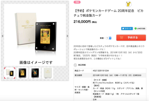 为了纪念《精灵宝可梦》集换式卡牌游戏20周年,任天堂旗下的宝可梦公司(Pokemon Company)与田中银座合作,推出了一款纯金的皮卡丘卡牌。