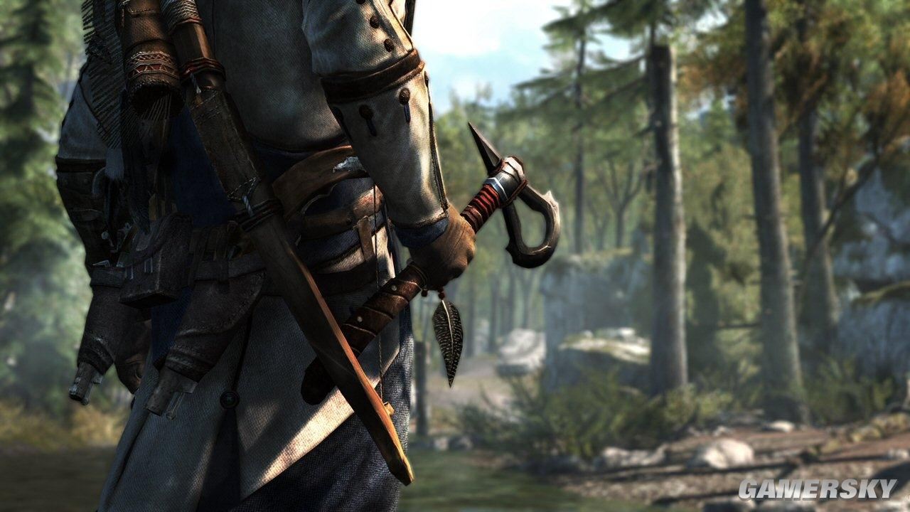 本作的设定与之前的《刺客信条》游戏大不相同。前作中紧凑的环境和耶路撒冷、威尼斯城中狭窄的街道可得为雪地风光,一望无际的树林和人口疏密的小城镇让路了。 本作中场景的大幅变化也意味着游戏的主人公康纳得翻山越岭来到此地。在这些环境之下,传统的刺杀方式依然可行,但在本作中,树木的作用变得更为重要。 本作中还将出现各种天气的变化,比如下雪,下雨,大雾等等。这就要求玩家去适应各种不同的场景,在房顶上来回穿梭时需要考虑更多的因素。 从悬崖边上眺望整个树林是一种美的享受,但更棒的是玩家们可以探索树林中的每一个角落。据称,该作可探索的范围约是《刺客信条:兄弟会》中罗马城的1.5倍。我们已经对此表示迫不及待了。 2. 追踪,捕猎,剥皮游戏的主角可是一位专业的猎人和追踪者。无论什么时候,当康纳远离城镇来到荒郊偏野时,他就会进行捕猎,尽管有时候他也会被诸如一头熊之类的追杀。康纳非常敬重野生动物,他通常喜欢用匕首干净利落地杀掉猎物而不是一枪毙了它们。但是动物的皮毛非常珍贵,可以拿去交易,所以我们可能会在剥皮和交易皮毛上花上不少的时间。我们还得知击杀不同的动物会得到不同的好处。有传言说,我们不仅可以剥下动物的毛皮,还可以挖取它们的内脏,并用内脏制造些什么。要是这样的话,捕猎可就是一件令玩家们非常激动的事了,我们可以在树林中追踪那些稀有的猎物。游戏中有大量树林和雪地场景,在捕猎的同时也可以让我们更多地关注一些杀人放火之外的事。                                                                                                             3. 战斗变得更具挑战性,用战斧砍向敌人的脑袋也很刺激《刺客信条》一直强调潜行。本作中,玩家可以操控人物躲在树顶观察敌人的动向。你也可以选择躲在树枝上等待巡逻经过。康纳在一片小范围区域内非常灵巧。在大规模战斗中,连击点和终结技从视觉效果上来说非常棒。战斗场面看起来非常暴力、野蛮。游戏中的大规模械斗将会非常精彩。