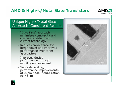 AMD的45纳米制程采用了他们的第四代应变硅(Fourth-generation Strained Silicon)技术,利用硅锗、双应力应变硅以及先进的应变记忆技术,能够有效提高晶体管的开关速度和电源效率。对于终端处理器而言,其运作时钟频率和效能均将从中获益。而在一些日后的45纳米产品上,AMD也计划采用超低K电介质(Ultra-low-k Dielectrics)以减少半导体芯片上晶体管间连接铜导线的延误率多达15%,这有助于芯片整体效能的提高。