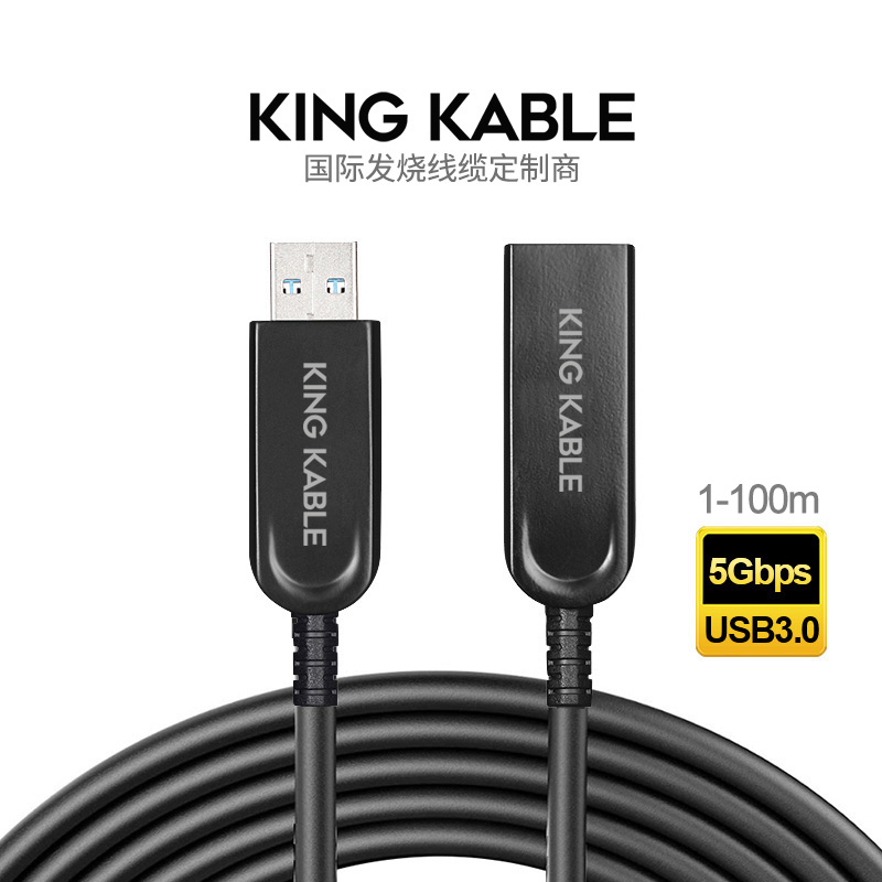 KING KABLE USB 3.0有源光缆(AOC)采用USB 3.0光电转换模块和光纤线缆制作而成。AOC有源光纤USB3.0线是一种光电转换技术,区别于传统铜缆的电输入,有源光纤USB3.0线缆在“连接器之间”使用了光纤作为传输导体。采用光电无损转换引擎,AOC有源光纤USB3.0极大提高电缆的速度和距离性能,而保证了设备的兼容性和高保真性。USB3.0有源光缆AOC可以将USB3.0传输的传输距离扩展到100米。  从USB标准规范来看,理论上USB1.1的传输速度可以达到12Mbps;USB2.0传输速度480Mbps(60MB/s);USB 3.0是最新的USB规范,通常用蓝色标记,最大传输带宽高达5.0Gbps(640MB/s)。传统铜芯线即使在增加芯片的情况下也仅能将USB3.0长度做到5米,而KING KABLE光纤USB3.0的诞生极大的提升了数据传输性能和效率,可实现无损传输100米。   同时,与常规铜线采用信号增强芯片来延长传输长度的方式不同的是,KING KABLE光纤USB3.0使用光纤,主要原因在于光纤传导的是光而非电脉冲,不会受到电磁干扰的影响,而且光纤本身并不发光,使得USB 3.0 AOC可以用于医学成像、广播电视、数字标牌、零客户端和其它抗干扰应用。  目前,KING KABLE针对终端客户和商业工程系统客户提供了众多完善的长距离无损数据传输方案,包括光纤USB Type A、光纤USB Type B/Type Micro B、光纤USB Type C、光端机、光纤熔接、拖链线、防水线等方案。  KING KABLE光纤USB3.0有源光缆产品特性: ● 最大传输距离超过100m ● 最高传输速度达5Gbps ● 支持热插拔 ● 无需专用驱动 ● 光缆更轻、更细,重量和体积较传统铜缆减少70% 以上 ● 具有极佳的抗电磁干扰特性 ● 可向下兼容USB2.0/1.1 设备(定制选择产品版本)  KING KABLE光纤USB3.0有源光缆产品应用: 1) 机器视觉领域 2) 工业打印领域 3) 安全监控领域 4) 数字标牌和电视墙 5) 零客户机系统 6) 远程存储系统