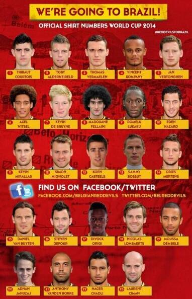 腾讯体育5月26日讯 比利时国家队正式公布了参加2014年巴西世界杯赛的球员号码,象征核心球员的10号被来自切尔西的阿扎尔获得,9号自然属于小魔兽卢卡库,来自曼联的天才球员贾努扎伊则身披20号战袍。 比利时在日前公布了最新一份的24人国家队名单,除了在门将位置上有4名球员,其他位置上都算是满打满算。这次在公布号码之时,主力门将库尔图瓦拿到了1号,二号门将米尼奥莱穿上了12号,另外两位门将卡斯蒂尔斯和普洛托的号码都是13号,这还意味着后两人之中将有一人遭到淘汰。 后防线方面,曼城队长孔帕尼得到4号球衣,热刺的费尔通亨穿走5号,阿森纳的维尔马伦拿下3号,马竞的替补阿尔德维尔德穿走了2号,拜仁老将范比滕分到了15号,比利时的后防线真可谓星光熠熠。 中前场方面,曼联后腰费莱尼穿走8号,同样是“蓬蓬头”的维塞尔穿走6号。埃弗顿双星卢卡库(目前仍租借在埃弗顿)和米拉拉斯分别拿下9号和11号, 切尔西核心阿扎尔穿走10号,曼联天才贾努扎伊则穿上了20号球衣。 附比利时队球员号码: 门将:1-库尔图瓦(马竞)、12-米尼奥莱(利物浦)、13-卡斯蒂尔斯(霍芬海姆)/普洛托(安德莱赫特) 后卫:2-阿尔德维尔德(马竞)、21-范登博雷(安德莱赫特)、23-希曼(标准列日)、4-孔帕尼(曼城)、15-范比滕(拜仁慕尼黑)、3-威尔马伦(阿森纳)、18-隆巴尔茨(泽尼特)、5-威尔通亨(热刺) 中场:6-维塞尔(泽尼特)、16-德福尔(波尔图)、8-费莱尼(曼联)、19-登贝莱(热刺) 、22-查德利(热刺)、7-德布劳内(沃尔夫斯堡) 、20-贾努扎伊(曼联) 前锋:9-卢卡库(埃弗顿)、17-奥利吉(里尔)、10-阿扎尔(切尔西)、14-梅尔滕斯(那不勒斯)、11-米拉拉斯(埃弗顿)
