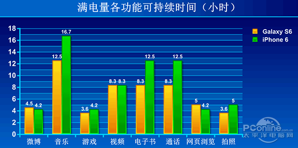 如果将耗电量数据转化为实际的使用小时数,那么我们可以明显感觉到iPhone的优势更大一些。在微博与网页浏览这两个短板上,iPhone 6只比Galaxy S6少了大概半个多小时的使用时间,而其他应用则领先几个小时。所以日常使用中,iPhone 6的续航体验应该会比Galaxy S6稍好一些。