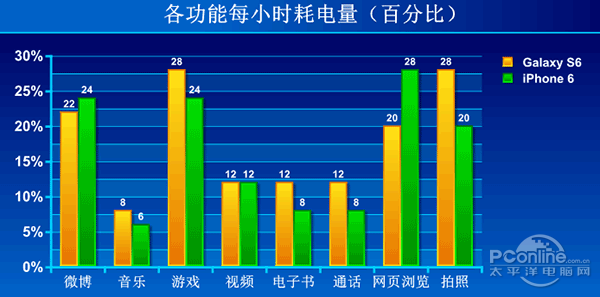 从5小时续航测试的结果来看,iPhone 6在测试结束后剩下22%的电量,而Galaxy S6则与S6 edge基本相似,余下了16%的电量。所以对于日常使用来说,iPhone 6与Galaxy S6坚持一天均没有太大的问题。
