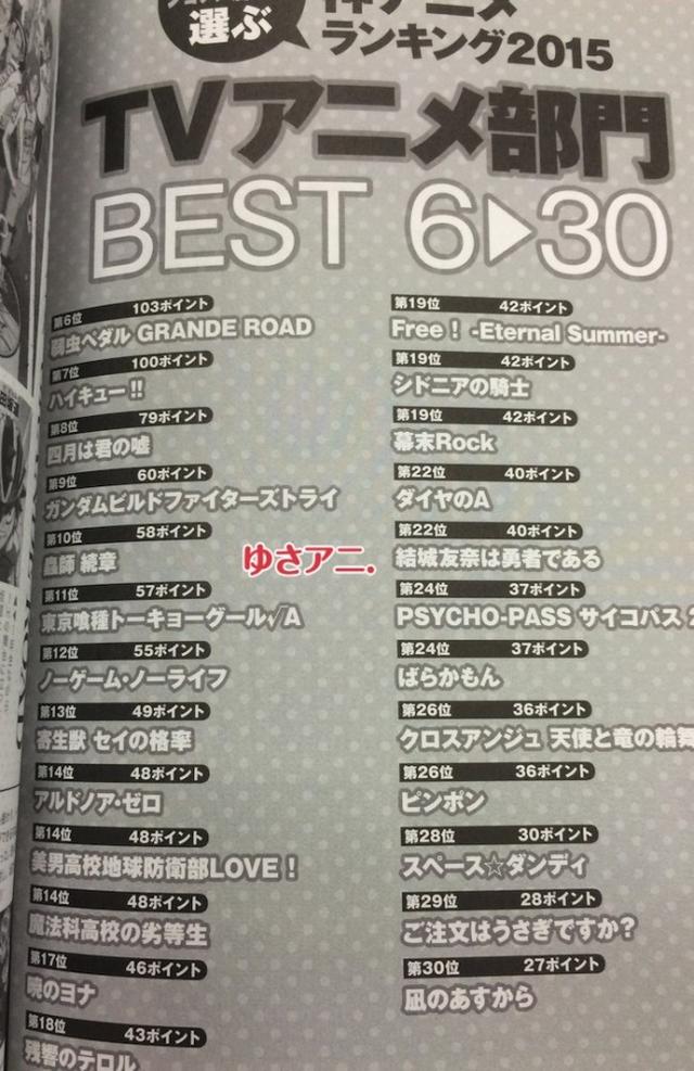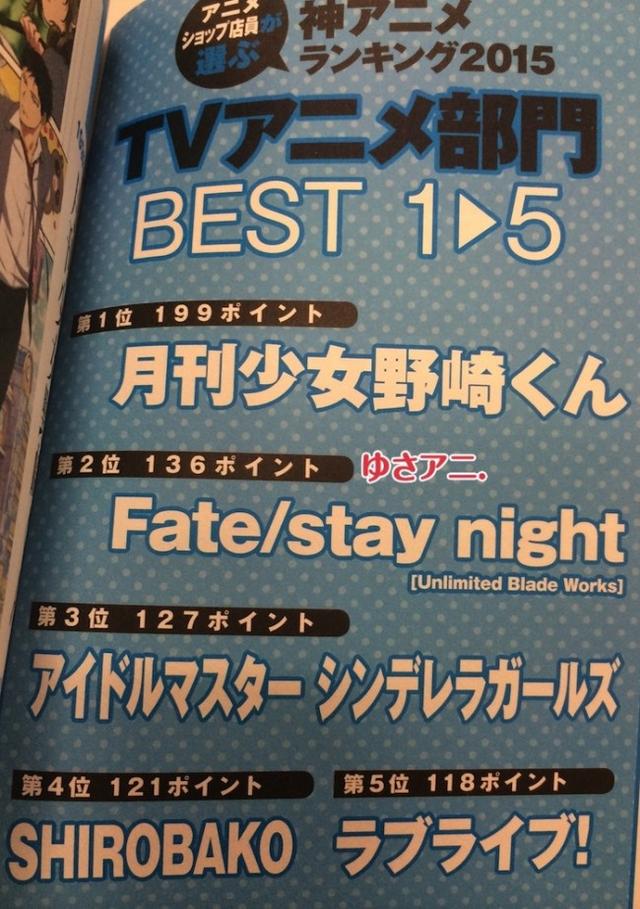 另外《白箱》和《Lovelive!》分列四五名。 另外,前三十名的结果也都已经公布,具体如下: 第一位 《月刊少女野崎君》199票 第二位 《Fate/stay night UBW》136票 第三位 《偶像大师灰姑娘女孩》127票 第四位 《白箱》121票 第五位 《Lovelive!》118票 第六位 《飙速宅男GRANDE ROAD》103票 第七位 《排球少年!!》100票 第八位 《四月是你的谎言》79票 第九位 《高达创战者 TRY 》60票 第十位 《虫师 续章》58票 第十一位 《东京喰种第二季》57票 第十二位 《NO GAME NO LIFE游戏人生》55票 第十三位 《寄生兽》49票 第十四位 《ALDNOAH.ZERO》48票 第十四位 《美男高校地球防卫部LOVE!》48票 第十四位 《魔法科高校的劣等生》48票 第十七位 《晨曦公主》46票 第十八位 《东京残响》43票 第十九位 《Free!-Eternal Summer-》42票 第十九位 《希德尼娅的骑士》42票 第十九位 《幕末Rock》42票 第二十二位 《钻石王牌》40票 第二十二位 《结城友奈是勇者》40票 第二十四位 《心理测量者》37票 第二十四位 《元气囝仔》37票 第二十六位 《天使与龙的轮舞》36票 第二十八位 《Space☆Dandy》30票 第二十九位 《请问您今天要来点兔子吗?》28票 第三十位 《来自风平浪静的明天》27票