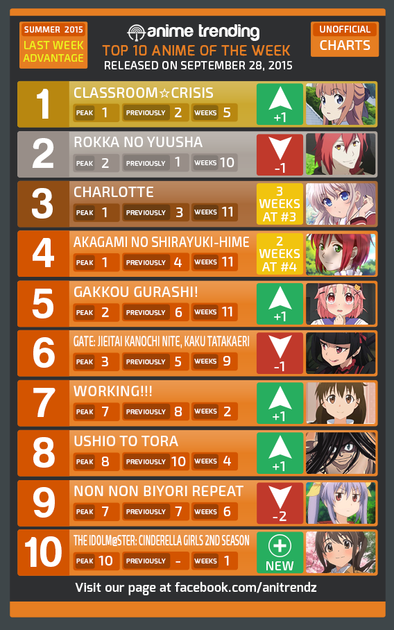 从排名而言,《教室☆危机》升至榜首。这部作品在最初显得比较慢热,然而随着剧情深入,无论从主线构思还是角色刻画都可以说赢得了观众们的一致好评。