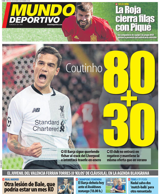 腾讯体育10月4日讯 今天的西班牙《世界体育报》透露了一个让人意外的消息,西甲豪门巴萨仍然没有放弃签下库蒂尼奥,在1月份的冬窗转会期,巴萨将重新追求状态不俗的巴西中场,而报价会达到1.1亿欧元。