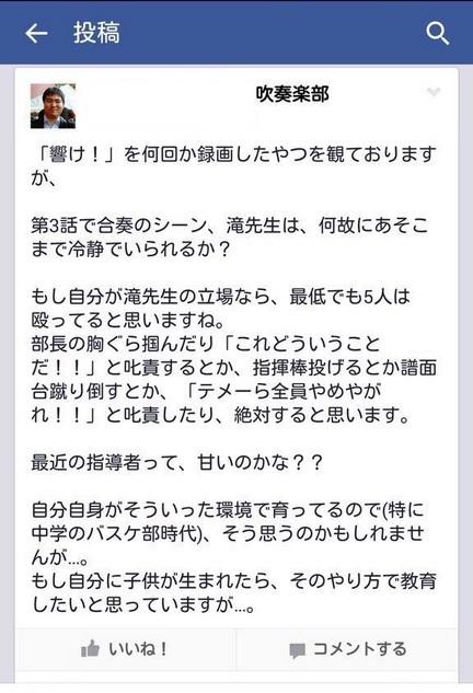 推特全文如下: 我听说有很多人把《吹响!上低音号》录下来看好几遍,可就我来说,第三集合奏的那个剧情里面,泷老师为什么会如此冷静呢? 如果我是泷老师的话,至少也会把这5个人狠狠揍一顿呢。比如抓住部长的胸口衣服说:“这到底是在搞毛啊!!”然后把指挥棒扔在一边,将放乐谱的台子给踢倒之类。然后怒斥:“你们这帮人不用再干了!!”我觉得是我的话绝对这么做。