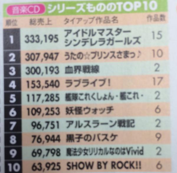其中,以333195张的销量笑傲群雄的作品是《偶像大师灰姑娘女孩》,并且这段时间官方一共带来了15张CD,从效率而言也是十分惊人。而《歌之王子殿下》的CD紧随其后,通过10张单曲获得了307947张销量的成绩。当然,如果算平均数的话,那么仅仅靠2张CD就卖出300193张的《幻界战线》只能用恐怖来形容了。另外,刚刚打破深夜档剧场版票房纪录的《Lovelive!》成绩为153540张,而《舰女人》的成绩是117285张。具体的排名如下: 名次 总销量 作品名 作品数 第一位 333195 《偶像大师灰姑娘女孩》 15 第二位 307947 《歌之王子殿下》 10 第三位 300193 《幻界战线》 2 第四位 153540 《Lovelive!》 17 第五位 117285 《舰女人》 2 第六位 109253 《妖怪手表》 6 第七位 96751 《亚尔斯兰战记》 2 第八位 76944 《黑子的篮球》 9 第九位 69798 《魔法少女奈叶Vivid》 2 第十位 63925 《SHOW BY ROCK!!》