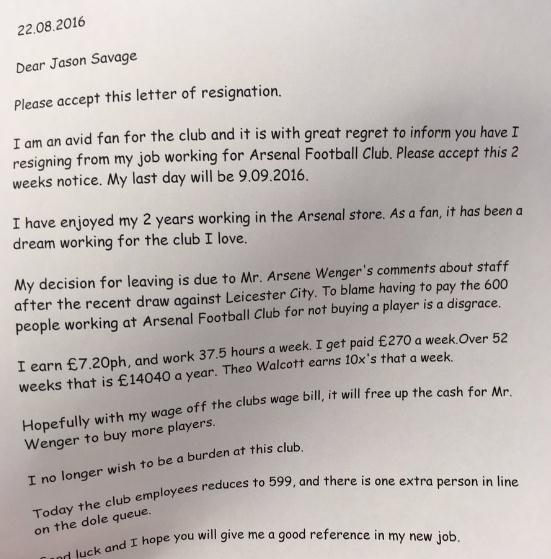 阿森纳员工辞职 阿森纳在今夏仅引进了扎卡、浅野拓磨以及霍尔丁三名新援,与其他英超豪门球队大手笔的引援相比略显寒酸。在英超首战中,阿森纳的中卫线主力球员全都遭遇了伤病的困扰,而温格只能排出霍尔丁以及钱伯斯两名小鲜肉,结果,阿森纳后卫被利物浦(数据) 完爆,丢了四个球。新赛季英超首轮主场输球也让阿森纳的球迷们非常的不满,在比赛的现场,就有许多枪迷们发出了要求温格买人的呼声。而在次战与莱斯特城打成平局后,球迷对于温格不买人的质疑也达到了顶点。 温格对于球迷们的质疑也给出了自己的解释,他表示自己要养活阿森纳的600名员工,因此难以在转会市场有大的投入。对于温格的甩锅,阿森纳的员工们也进行了反击。近日,一位阿森纳的员工在推特上晒出了一封辞职信,他表示自己的周薪仅有270英镑,员工工资并不会成为球队的负担,而为了“帮”温格省钱买人,他决定辞职。 这位员工在辞职信上写到:“亲爱的主管,请您接受我的这封辞职信。一直以来,我都是这支球队的粉丝,但是现在我很遗憾的告诉您,我要辞去在阿森纳的工作。我提前两个星期向您告知我的离队决定,我最后一天在阿森纳工作是在下个月的9日。我很享受在过去的两年在阿森纳商店的工作,能够为自己喜欢的俱乐部工作是我的梦想。” “我决定离开是因为温格之前的一番言论,他把阿森纳不买球员的原因归结于俱乐部要给600名员工支付薪水,这简直是一个耻辱。我每个小时的薪水7.20镑,每周37.5个小时。每周的薪水是270镑。每年工作超过52周总计14040镑,而枪手的球员沃尔科特一周的薪水就是10万英镑。我再也不想成为球队的负担了。从今天开始,俱乐部的雇员减少到了599人了,而社会上的失业人员会多一个。祝您好运,希望您能够为我下一份新工作写一封推荐信。” 值得一提的是,目前这位员工的真实身份还有待核实,但是这封信也是阿森纳球迷以及员工的心声的真实体现。毕竟与其他英超对手们相比,阿森纳在今夏的引援确实过于低调。 (踏雪无痕)