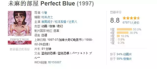 他导演的《千年女优》、《红辣椒》豆瓣评分都在8.5分以上。