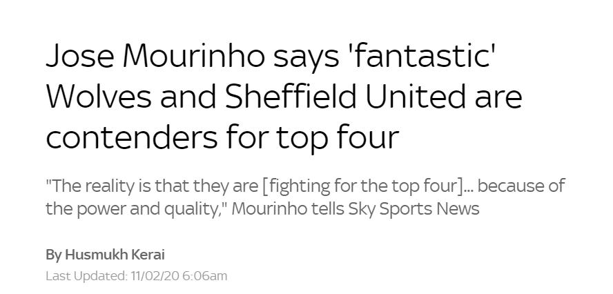 在这里,穆里尼奥绝口称赞了两支球队:一个是升班马谢菲尔德联,另一个则是自己徒弟的球队狼队。先说谢菲联,在率先进行完的26轮比赛中谢菲联2-1战胜了伯恩茅斯,前26轮进输掉7场比赛,谢菲联是18年来,同阶段输球最少的升班马。可见,其状态有多么出色。而狼队,上赛季升入英超之后,拿到了第7名。可以说,震惊了英超。本赛季,如果不是受双线作战的影响,他们的积分可以更高。