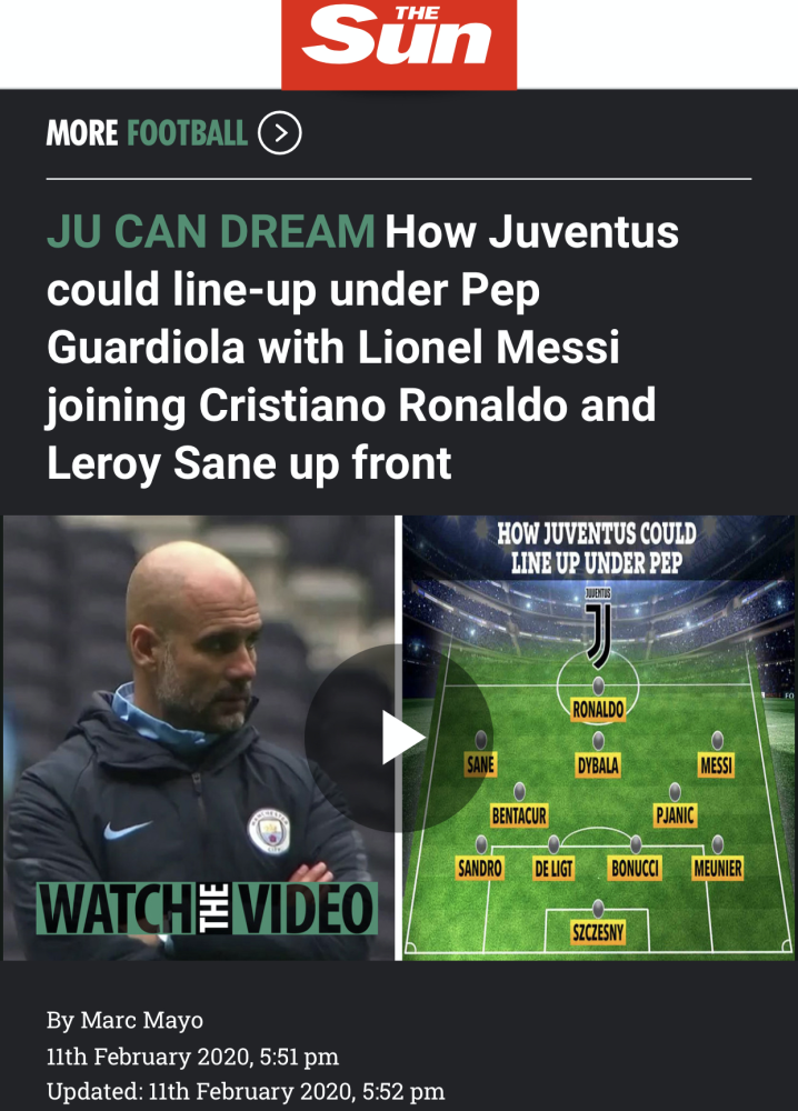 C罗顶到中锋是很自然的选择,这位刚刚度过35岁生日的葡萄牙巨星进球能力依然在线。本赛季20场联赛就已经接近了上赛季31场的进球纪录,有萨内、迪巴拉、梅西在身后提供支援,尤文前场攻击四重奏给予对方防线的打击是全方位的。任何一名球员都有能力制造威胁,不停的换位让对方防不胜防。 这样一套阵容自然需要有一位足坛名帅来执教,因此《太阳报》为尤文安排了瓜帅。手下尽是好牌,瓜帅的战术理念可以迅速在此生根发芽,发挥威力。