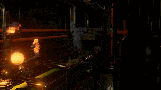 “自适应稀疏体素网格也被用于计算烟雾的自阴影(self-shadowing),从而提高烟雾轮廓的真实感和识别度。流体模拟支持与环境中物体的碰撞效果,同时燃料口也是实时塑形的,因此整个火焰特效模拟是完完全全交互式的。”