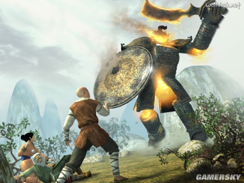 当BioWare2007年被EA收购时,大家都不担心《质量效应》和《旧共和国武士》这两大系列今后的发展。可现如今《质量效应》三部曲大红大紫,但《旧共和国武士》化身网游,正统续作至今没有下文,不免让人伤感。而更加值得同情的是另一部昙花一现的大作《翡翠帝国(Jade Empire)》。距离BioWare换主已经6年过去,这一系列还是杳无音信。 ] 《翡翠帝国》在当年也红极一时,游戏的故事背景设定来在架空的古代中国,那里有魔法、精灵、恶魔和强大的武术。玩家可以在游戏开始前定制自己的角色,选择自己专精武术或者是“气(chi,不是吃)”。气的设定类似于魔法,可用来攻击敌人或者治疗自己。笔者选择的是吴莲华(Wu the Lotus Blossom和许多富有中国元素的外籍游戏一样,角色名字像是中二病时期的网游ID),一个技能相对兼顾的角色。正好就是下图游戏封面上的这位美籍华人。