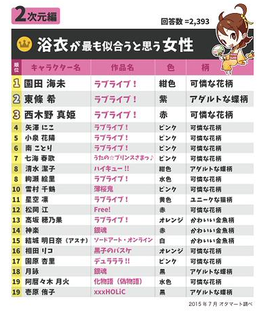【你认为最适合穿泳装的女性】 第一位 东条希(《Lovelive!》) 第二位 绚濑绘里(《Lovelive!》) 第三位 西木野真姬(《Lovelive!》) 第四位 矢泽日香(《Lovelive!》) 第四位 南小鸟(《Lovelive!》) 第六位 桃井五月(《黑子的篮球》) 第七位 星空凛(《Lovelive!》) 第八位 小泉花阳(《Lovelive!》) 第九位 娜美(《ONE PIECE》) 第十一位 清水洁子(《排球少年!!》) 第十二位 园田海未(《Lovelive!》) 第十三位 结城明日奈(《刀剑神域》) 第十四位 松冈江(《Free!》) 第十五位 高坂穗乃果(《Lovelive!》) 第十六位 雪村千鹤(《薄樱鬼》) 第十八位 雪莉露·诺姆(《超时空要塞F》) 第十九位 月咏(《银魂》) 第二十位 神乐(《银魂》) 浴衣方面,依然是《Lovelive!》的角色·园田海未名列榜首,而东条希和西木野真姬排在二三位。具体如下: