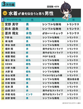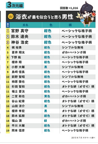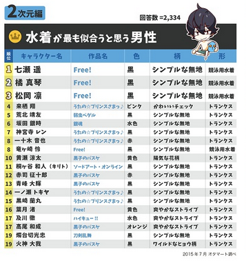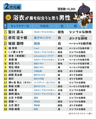 第一位 七濑遥(《Free!》) 第二位 橘真琴(《Free!》) 第三位 松冈凛(《Free!》) 第四位 来栖翔(《歌之王子殿下》) 第五位 荒北靖友(《飙速宅男》) 第六位 坂田银时(《银魂》) 第七位 神宫寺莲(《歌之王子殿下》) 第八位 一十木音也(《歌之王子殿下》) 第八位 龙崎怜(《Free!》) 第十位 黄濑凉太(《黑子的篮球》) 第十一位 桐谷和人(《刀剑神域》) 第十二位 赤司征十郎(《黑子的篮球》) 第十三位 青峰大辉(《黑子的篮球》) 第十四位 一之濑时也(《歌之王子殿下》) 第十五位 黑崎兰丸(《歌之王子殿下》) 第十六位 叶月渚(《Free!》) 第十七位 及川彻(《排球少年!!》) 第十七位 高尾和成(《黑子的篮球》) 第十九位 烛台切光忠(《刀剑乱舞》) 第二十位 火神大我(《黑子的篮球》) 而浴衣方面则是圣川真斗、赤司征十郎以及坂田银时名列前三,TOP20的排名如下: