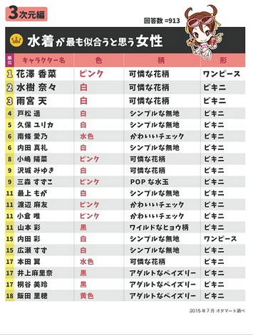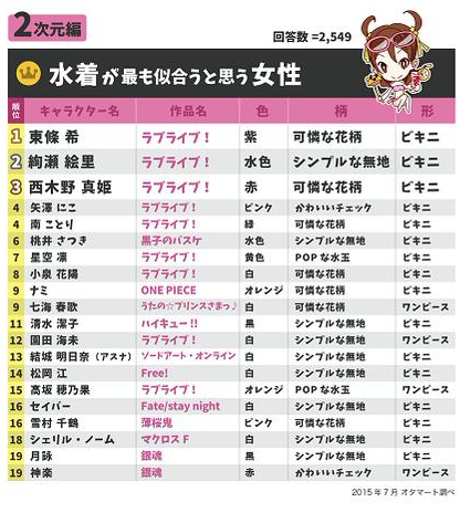 动漫作品的魅力往往跟角色密不可分,而每当角色穿上泳装或者浴衣的时候,就更有几分别样的风采。那么究竟哪些女性角色最适合这两种服装呢?近日就有媒体对于动漫迷进行了调查。 泳装方面,《Lovelive!》的东条希、绚濑绘里、西木野真姬分列前三位,而LL系的女主角基本全部上榜。此外例如结城明日奈、Saber、神乐等知名角色也都榜上有名。