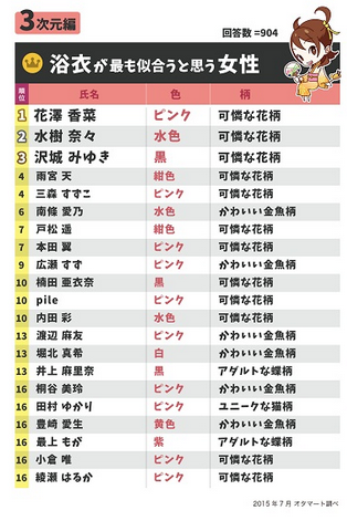 第一位 花泽香菜 第二位 水树奈奈 第三位 雨宫天 第四位 户松遥 第五位 久保由利香 第六位 南条爱乃 第六位 内田真礼 第八位 小嶋阳菜 第九位 泽城美雪 第九位 三森铃子 第十一位 最上Moga 第十一位 渡边麻友 第十一位 小仓唯 第十一位 山本彩 第十五位 内田彩 第十五位 广濑铃 第十七位 本田翼 第十七位 井上麻里奈 第十七位 桐谷美玲 第十八位 饭田里穗 至于浴衣,花泽香菜和水树奈奈依然是前两名的人选,不过第三被泽城美雪获得。 【你认为最适合穿浴衣的女性三次元篇】