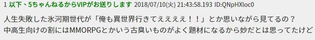 今年6月,日本经济新闻报纸刊登了一篇报道,内容分析异世界作品的主要粉丝是30到40岁的大叔,原因是他们都由于人生不如意而梦想着能够“重来一次”,并且穿越之后可以实现各种遥不可及的愿望。然而从报纸发行之后到现在的一个多月时间里,许多日本网友依然对此争论不休,有人认为这种作品更受未成年人喜爱,也有人觉得报纸说得没错,逃避现实是必须的。