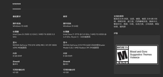 最低要求: 操作系统:Windows 10 64位 处理器:Intel Core i5-2500 3.3 GHZ / AMD FX-8300 3.3 GHz 显卡:NVIDIA GeForce 770 GTX 4096 MB / ATI R9 380X 4096 MB或更高 内存:8 GB RAM DirectX:版本11 可用存储空间:40 GB 推荐: 操作系统:Windows 10 64位 处理器:Intel Core i7-3770 @ 3.5 GHz / AMD FX-8350 @ 4.0 GHz, Ryzen 5 - 1400或更高 显卡:NVIDIA GeForce GTX 970 (4GB VRAM带Shader Model 5.0) / AMD Radeon R9 290或更高 内存:8 GB RAM DirectX:版本11 可用存储空间:40 GB