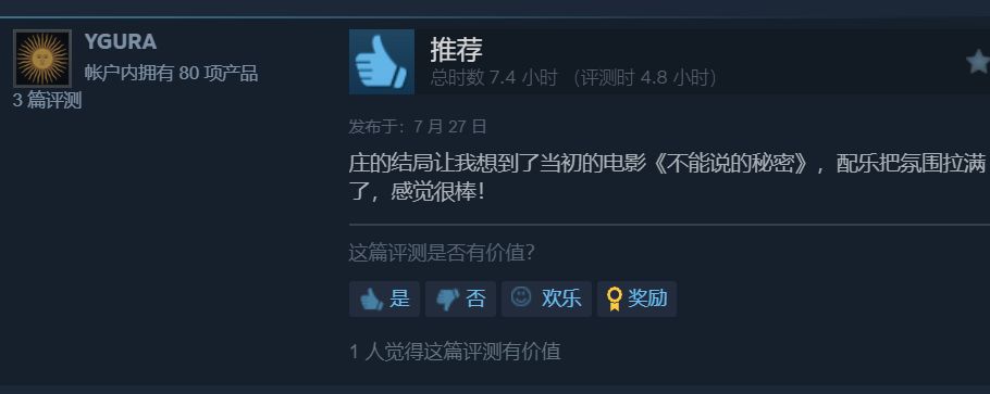 在评论区同样也有人享受,甚至感慨这个游戏如同周董的不能说的秘密,在我实际体验之后,游戏的确是从未体味过的美好,可能是过于主观,但我也非常喜欢庄的结局,特别是那个配音