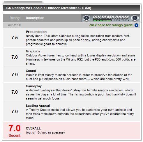 《坎贝拉野外冒险》(Cabela's Outdoor Adventures) 《坎贝拉野外冒险》(X360)评分: 整体感觉7.5分 画面表现7.0分 声效表现7.0分 手感操作7.0分 耐玩性7.0分 总评:7.0分