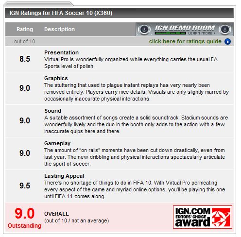 《FIFA 10》(FIFA 10) 《FIFA 10》(X360)评分: 整体感觉8.5分 画面表现9.0分 声效表现9.0分 手感操作9.0分 耐玩性9.5分 总评:9.0分