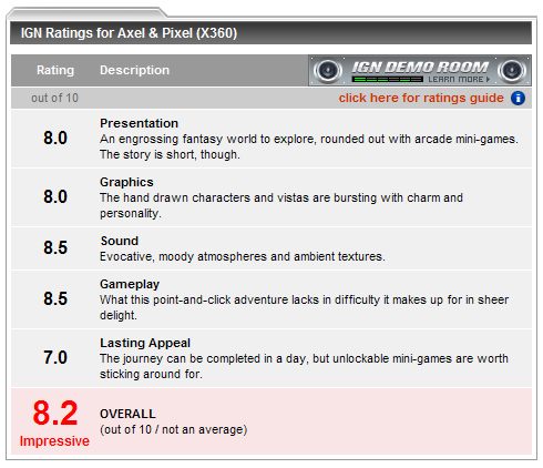 《Axel & Pixel》(Axel & Pixel) 《Axel & Pixel》(X360)评分: 整体感觉8.0分 画面表现8.0分 声效表现8.5分 手感操作8.5分 耐玩性7.0分 总评:8.2分