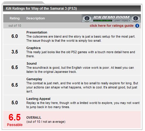 《侍道3》(Way of the Samurai 3) 《侍道3》(PS3)评分: 整体感觉6.0分 画面表现3.5分 声效表现6.5分 手感操作6.5分 耐玩性5.0分 总评:6.5分
