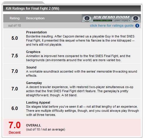 《快打旋风2》(Final Fight 2) 《快打旋风2》(Wii)评分: 整体感觉5.0分 画面表现7.5分 声效表现7.0分 手感操作7.0分 耐玩性6.0分 总评:7.0分