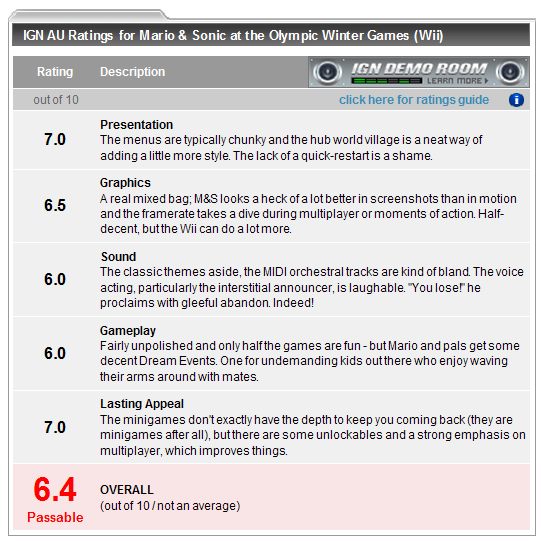 《马里奥与索尼克在冬奥会》(Mario & Sonic at the Olympic Winter Games AU) 《马里奥与索尼克在冬奥会》(Wii)评分: 整体感觉7.0分 画面表现6.5分 声效表现6.0分 手感操作6.0分 耐玩性7.0分 总评:6.4分