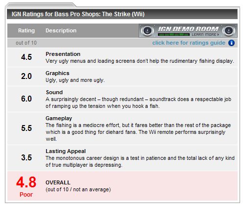 《食饵》(Bass Pro Shops: The Strike) 《食饵》(Wii)评分: 整体感觉4.5分 画面表现2.0分 声效表现6.0分 手感操作5.5分 耐玩性3.5分 总评:4.8分