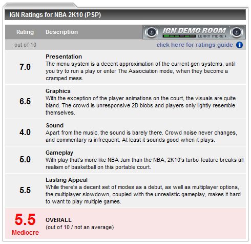 《NBA 2K10》(NBA 2K10) 《NBA 2K10》(PSP)评分: 整体感觉7.0分 画面表现6.5分 声效表现4.0分 手感操作5.0分 耐玩性5.5分 总评:5.5分