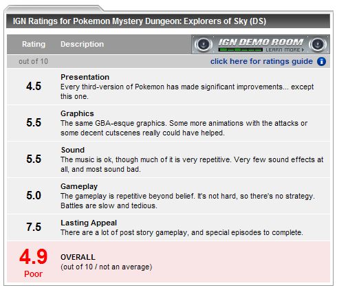 《口袋妖怪神秘地牢:天空探险》(Pokemon Mystery Dungeon: Explorers of Sky) 《口袋妖怪神秘地牢:天空探险》(NDS)评分: 整体感觉4.5分 画面表现5.5分 声效表现5.5分 手感操作5.0分 耐玩性7.5分 总评:4.9分