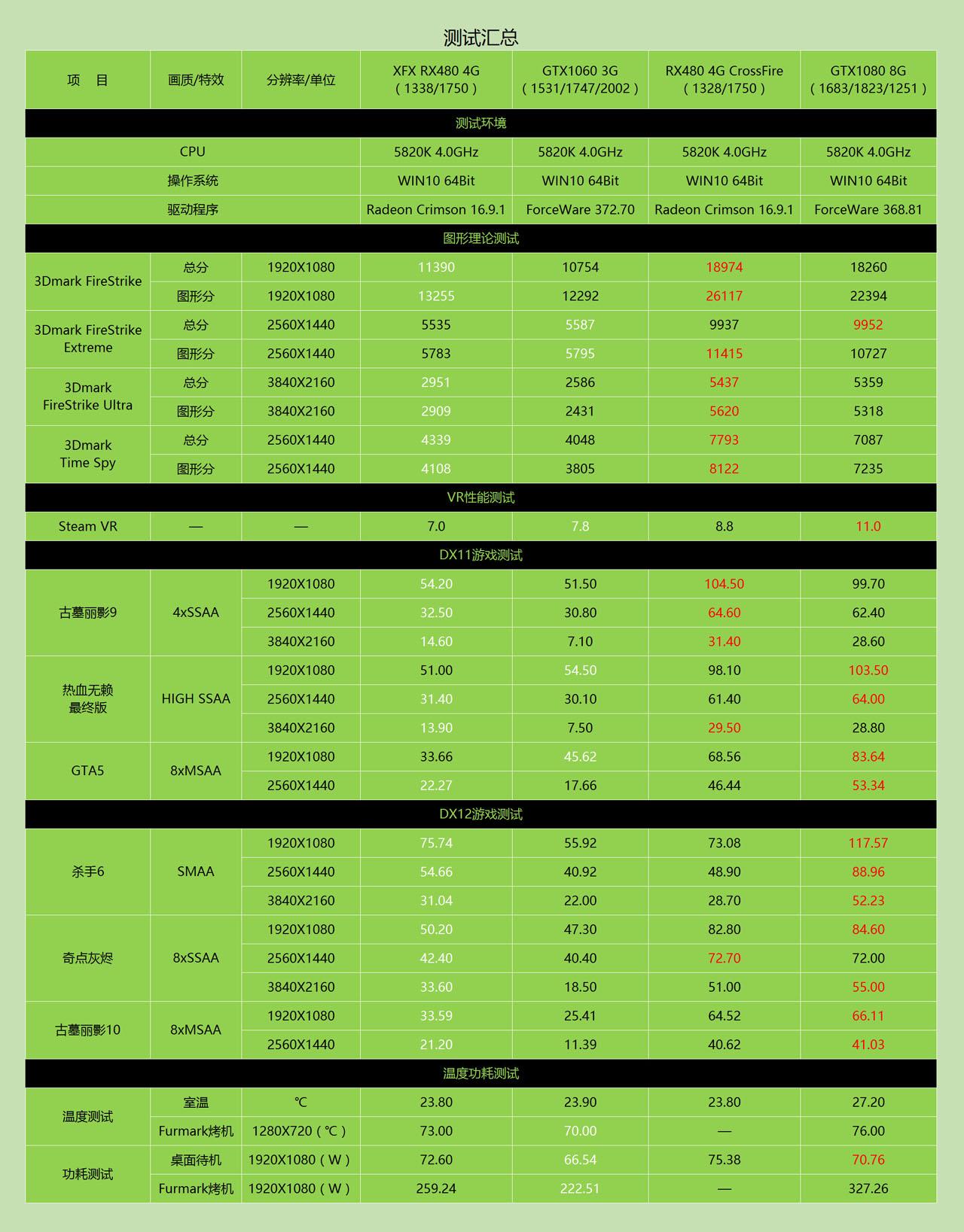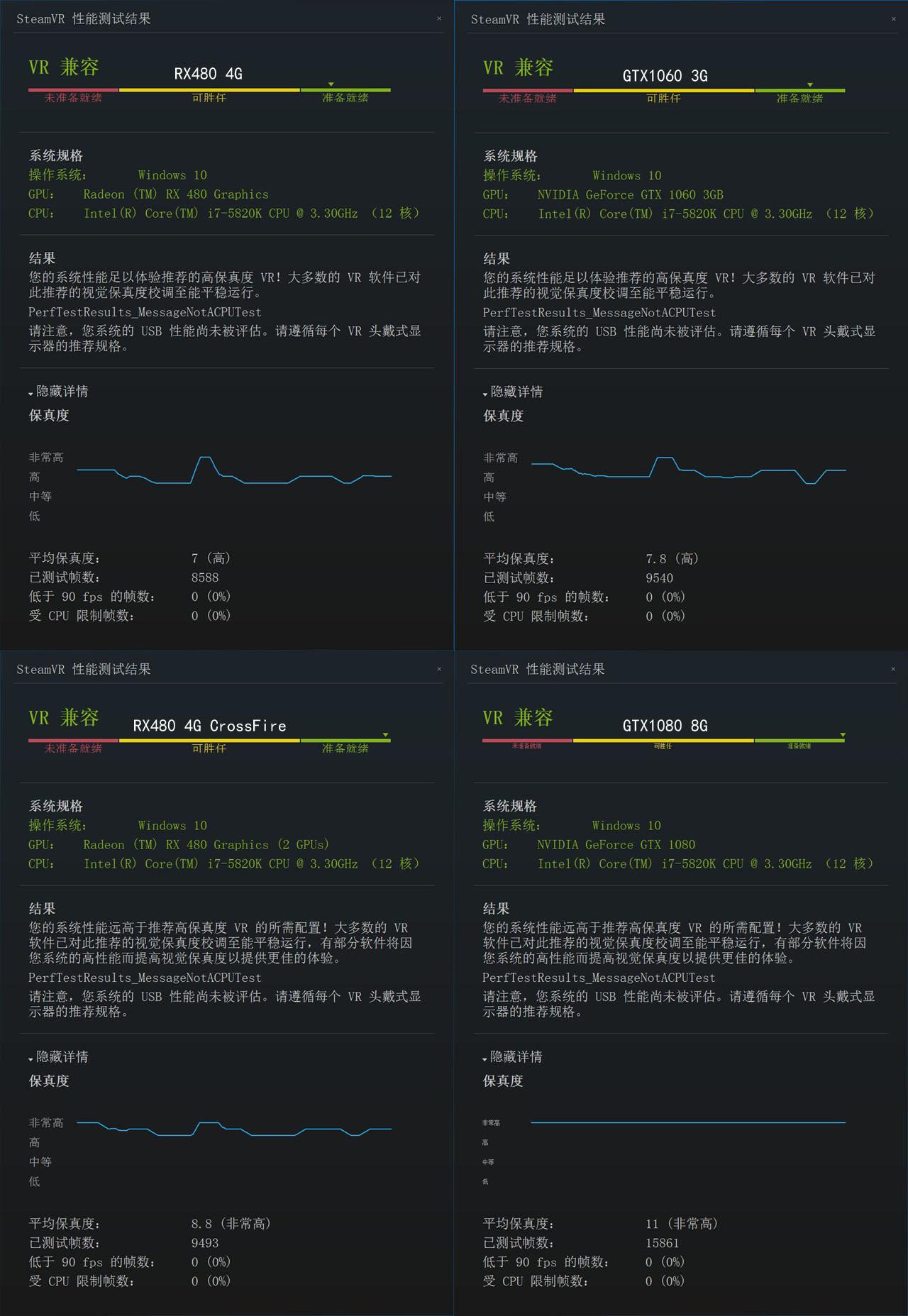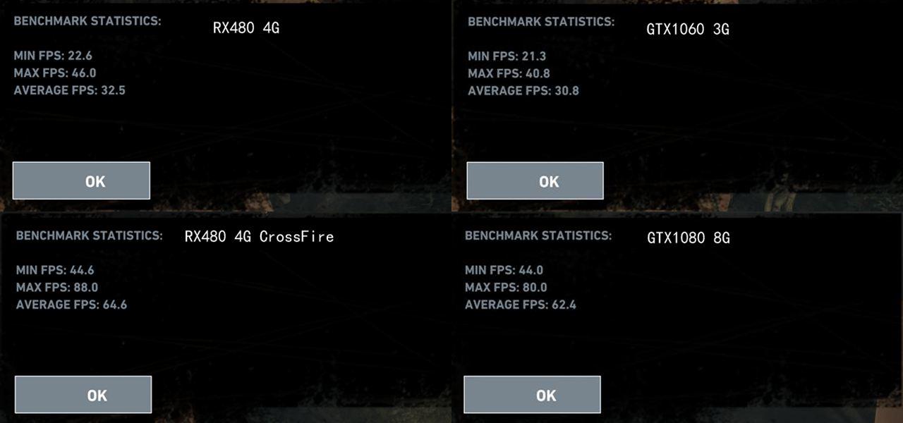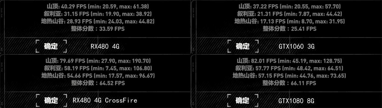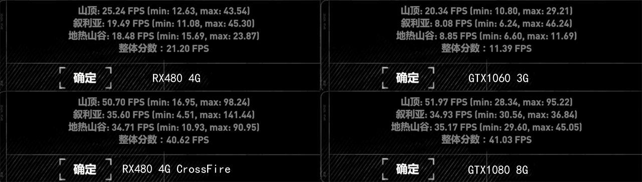 测试结果,1080P分辨率下,单卡GTX1060 3G小胜RX480 4G,GTX1080 8G也小胜双卡RX480 4G
