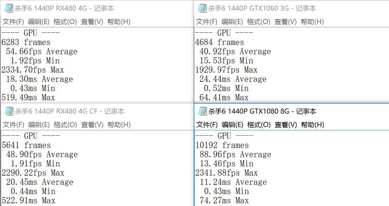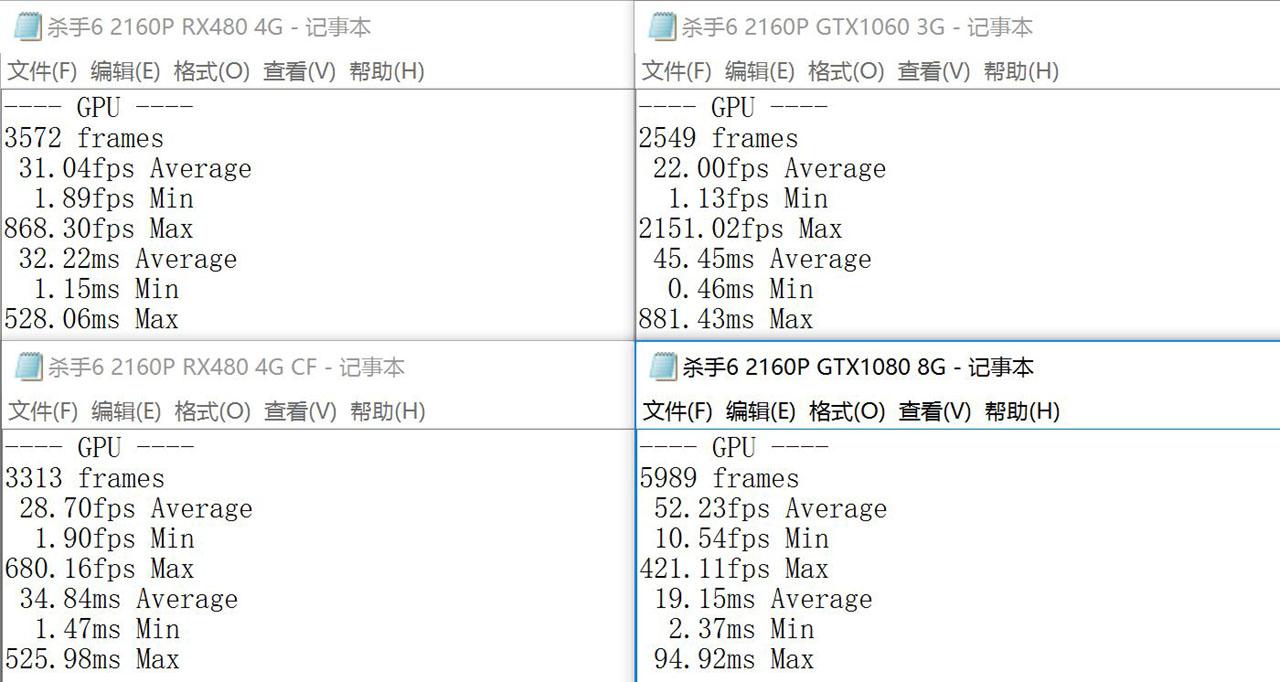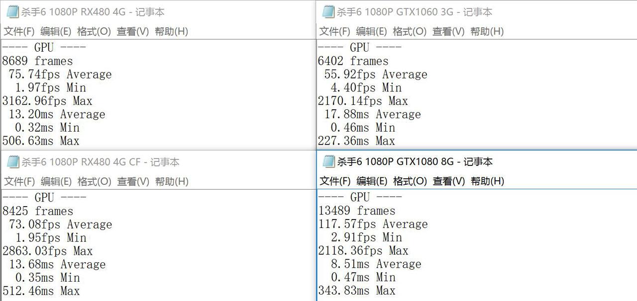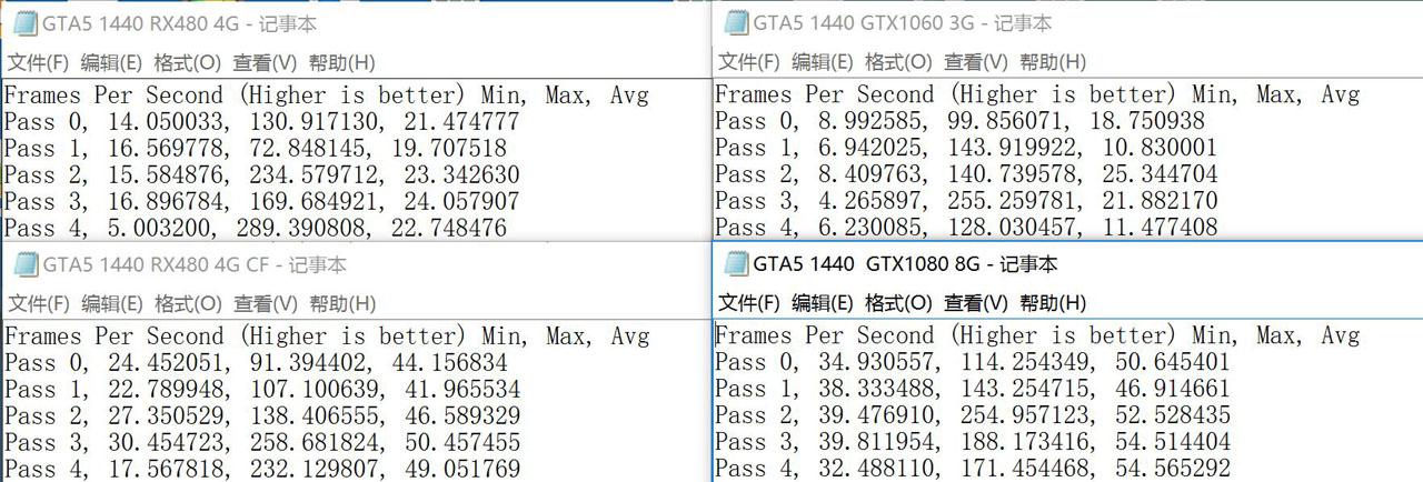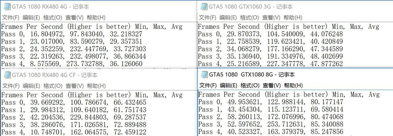 GTA5的测试结果以文本文档形式显示,由于该游戏是偏N的游戏,所以1080P分辨率下,单卡RX480 4G不敌GTX1060 3G,双卡RX480 4G也不敌GTX1080 8G