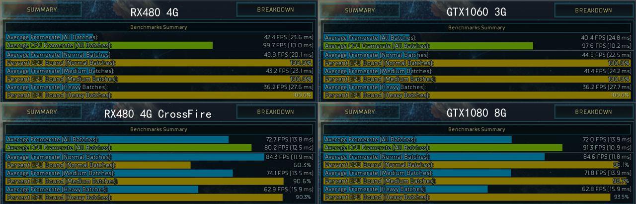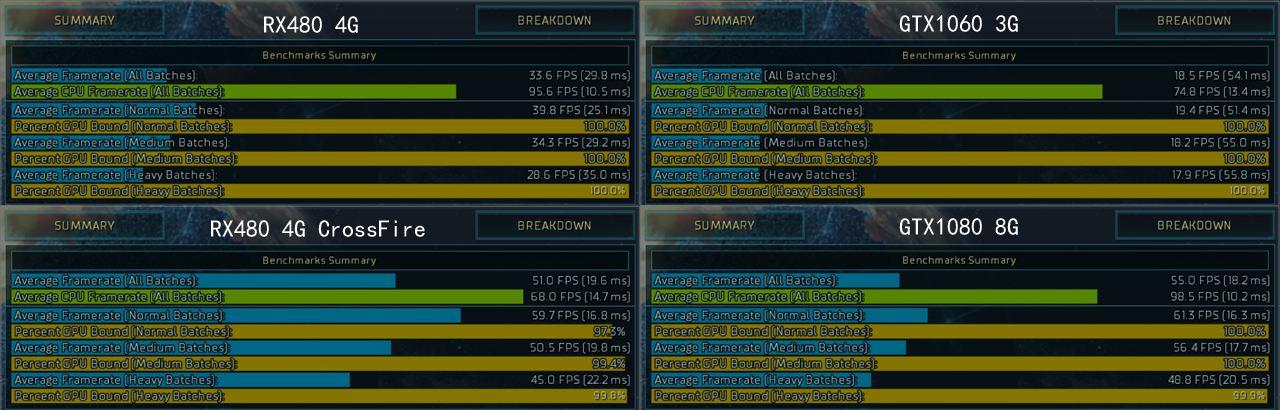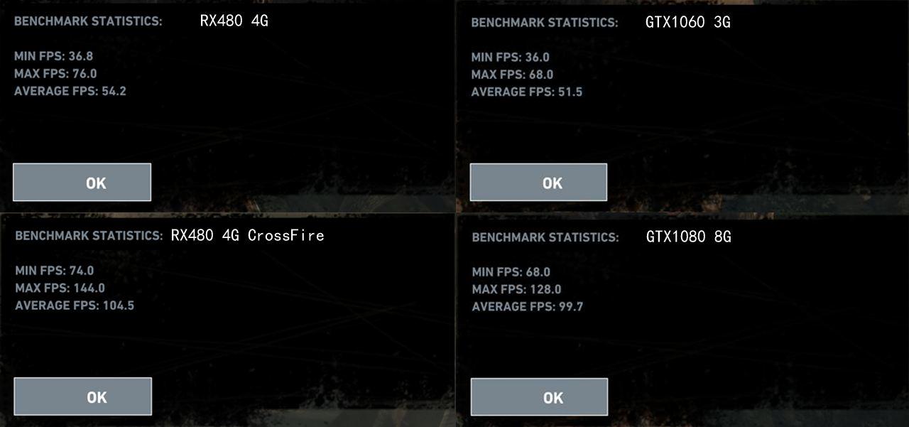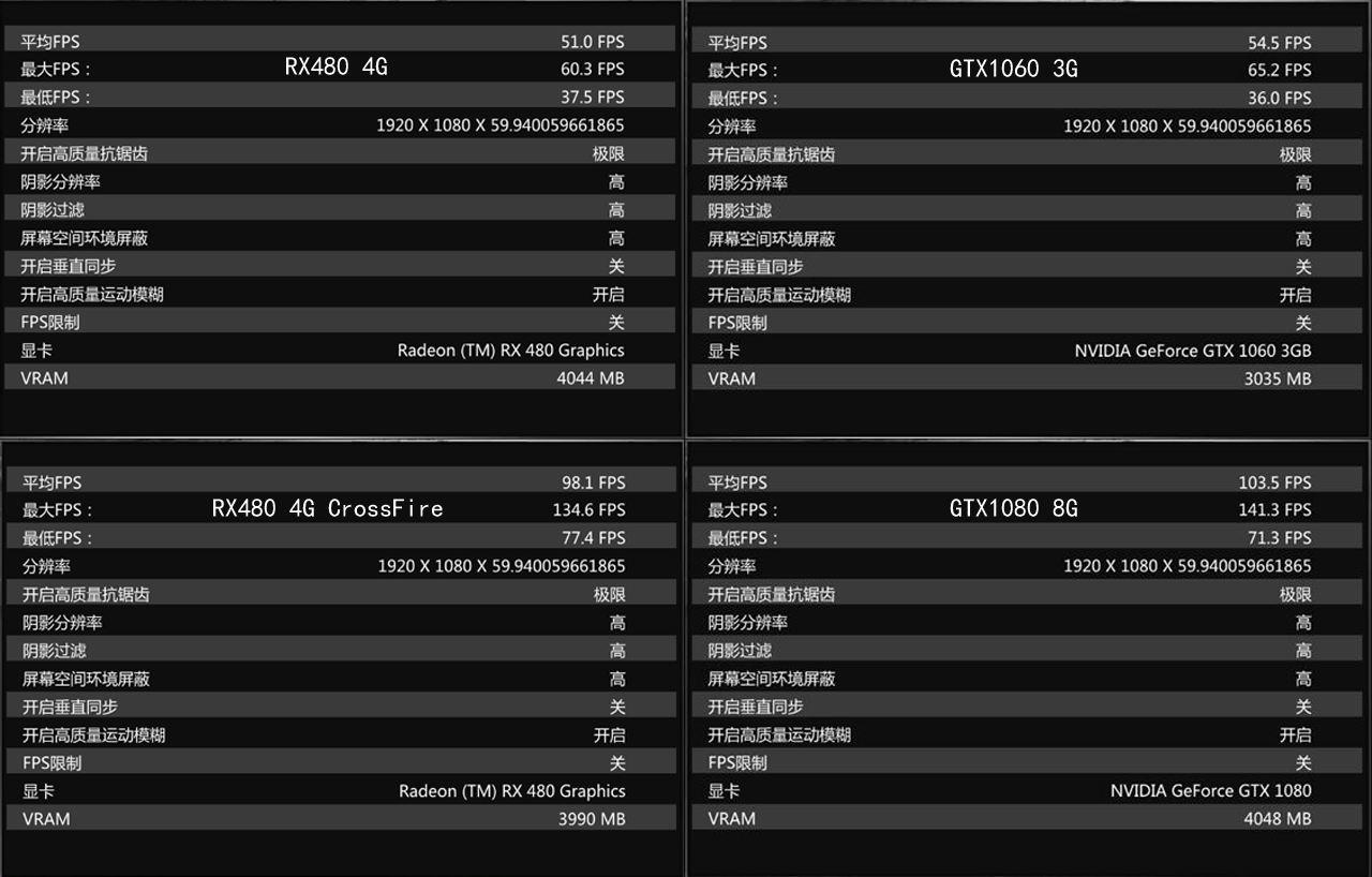 测试结果,1080P分辨率下,单卡RX480 4G小胜GTX1060 3G,双卡RX480 4G也小胜GTX1080 8G