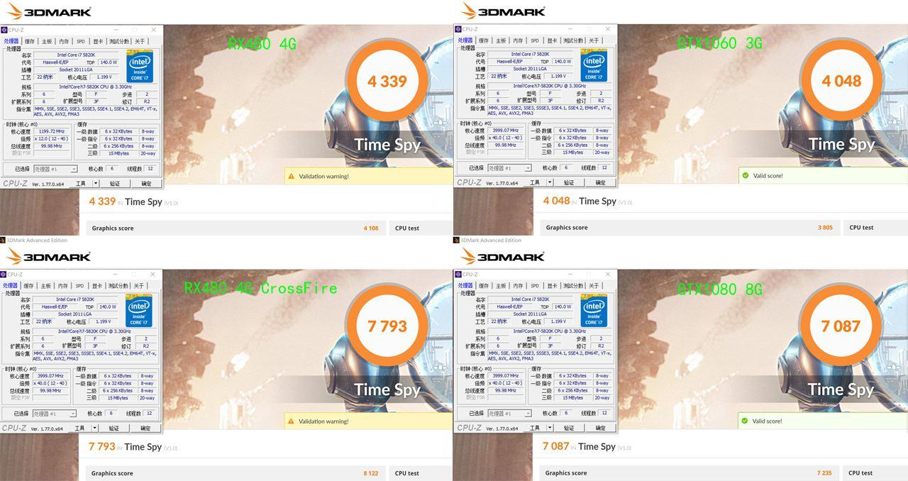 3Dmark Time Spy是3Dmark新加入的一项测试,主要测试系统的DX12图形性能,该项测试单卡480 4G小胜,双卡也小胜。