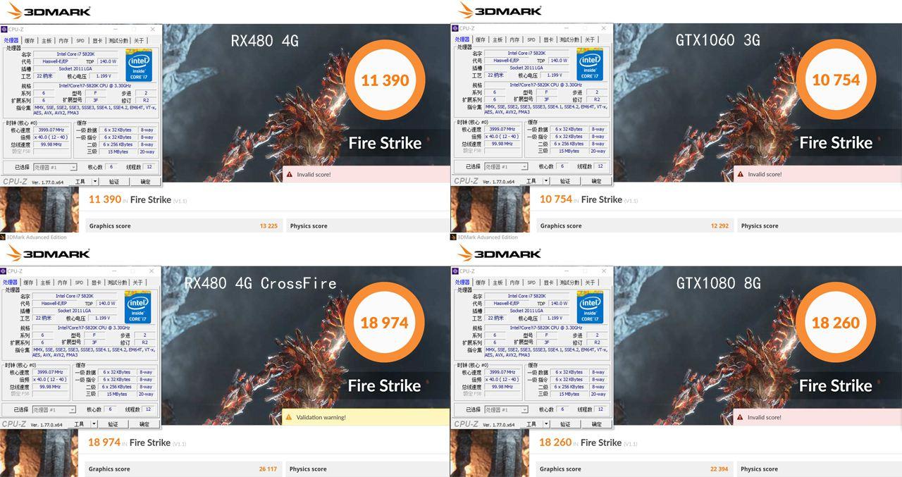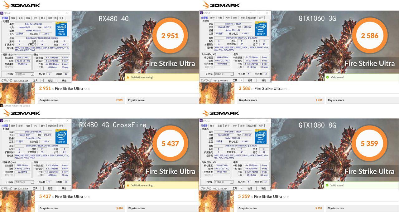 下面就开始跑分了,大家别看区区几十张图,撸主为了好让大家有个概念,所以拉了GTX1060 3G和GTX1080 8G来进行对比,然而这样一来,工作量非常的大,每张卡跑5个理论测试,4张卡就是20个。每张卡跑6个游戏,每个游戏开2-3个分辨率,下来总共需要跑64次游戏。 为了便于观看,老司机把所有数据都放到一张图里了,上一行是480 4G单卡对1060 3G单卡,下一行是480 4G交火对1080 8G单卡。先看3Dmark FireStrike,无论是单卡还是双卡,A卡都小胜N卡。