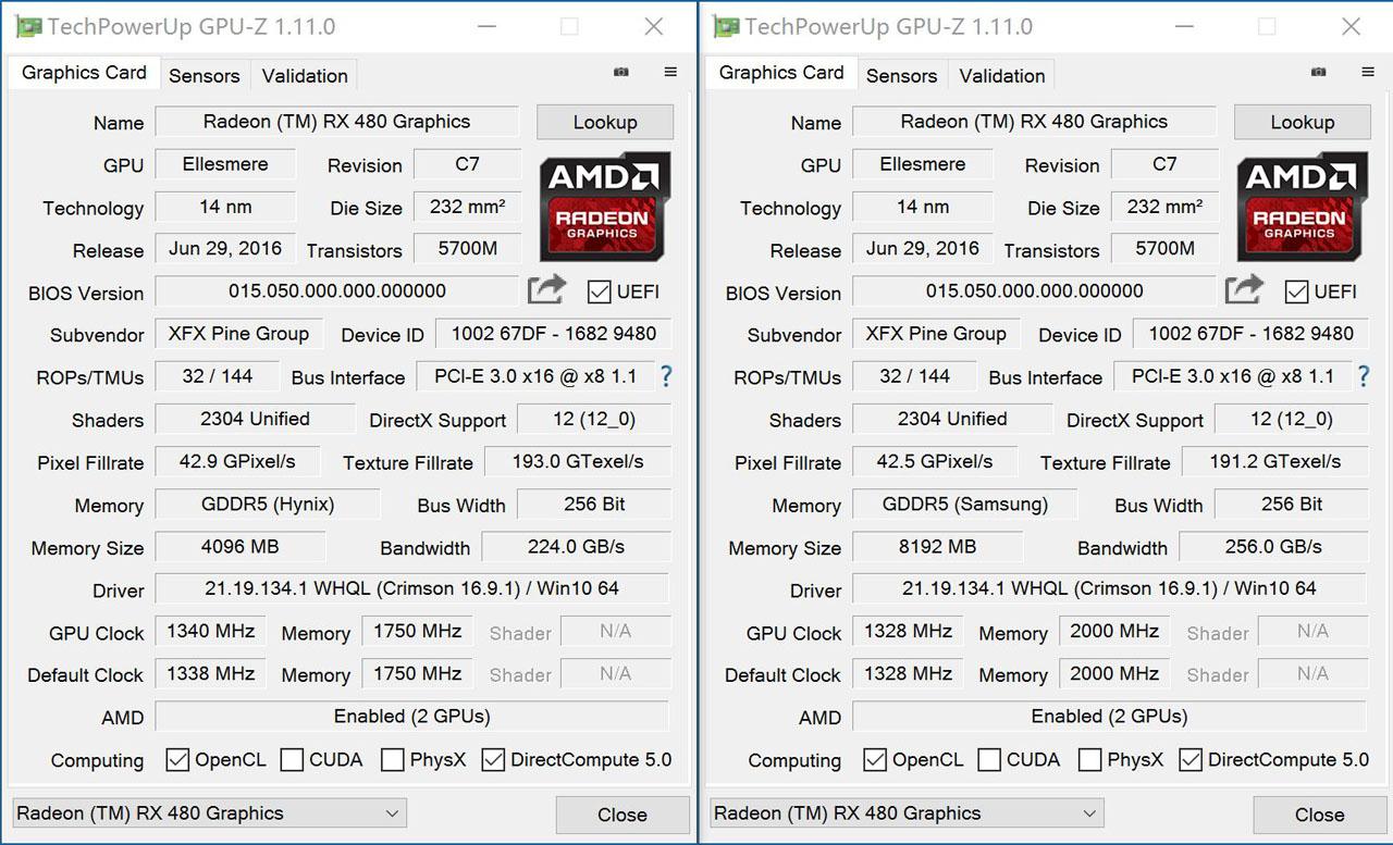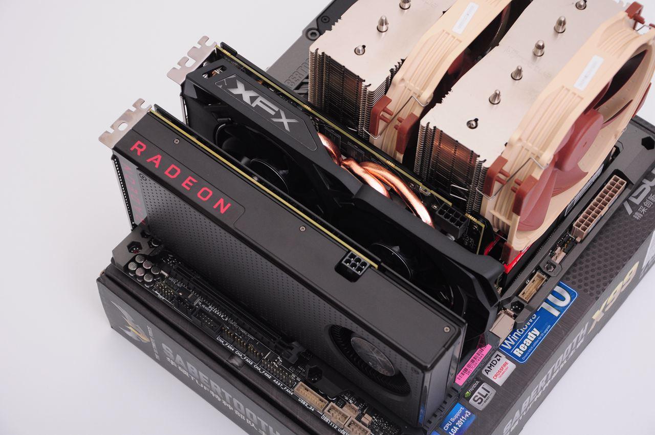 话说这中秋佳节,一众土豪携美游山玩水,老司机看了看双手,决定还是宅在家继续搞机吧,毕竟前人说的好:“土豪坦荡荡,屌丝常搞机”。只不过没想到这次搞机之旅,却扯出一件惊天大事! 是神马惊天大事呢?却是本人的那张Z170-AR经受不住散热器扣具的洪荒之力,就那么夭折了。。。。。 搞机事业不可废,主板挂就挂吧,含着泪也要把分(bi)跑(zhuang)完,Z170挂了,换X99从头再来。 言归正传,虽然东西挂了,好在有保修,所以也不是啥大问题。老司机在这里强烈建议大家,买东西一定要带质保的,买东西一定要带质保的,买东西一定要带质保的,工包货洋垃圾虽然便宜,但出了问题,真的很蛋疼! 这次老司机带给大家的是RX480 4G版双卡交火的体验,网上RX480 8G和4G的单卡评测见得多了,但双卡交火的还很少,这部分内容,就让老司机用这篇文章来告诉大家吧。 要交火,首先你得有两张显卡。 下图左侧为XFX RX480 4G 黑狼 进化,右侧为XFX公版RX480 8G,由于交火的显存不叠加特性,所以4G版和8G版混搭交火,其实等同于两张4G版交火,8G那张卡多出来的4G显存,其实并没有什么用。所以要实际用的,要么4G+4G要么8G+8G,别玩混搭哦,本人这里只为演示,大家把另一张8G的卡当成4G即可。