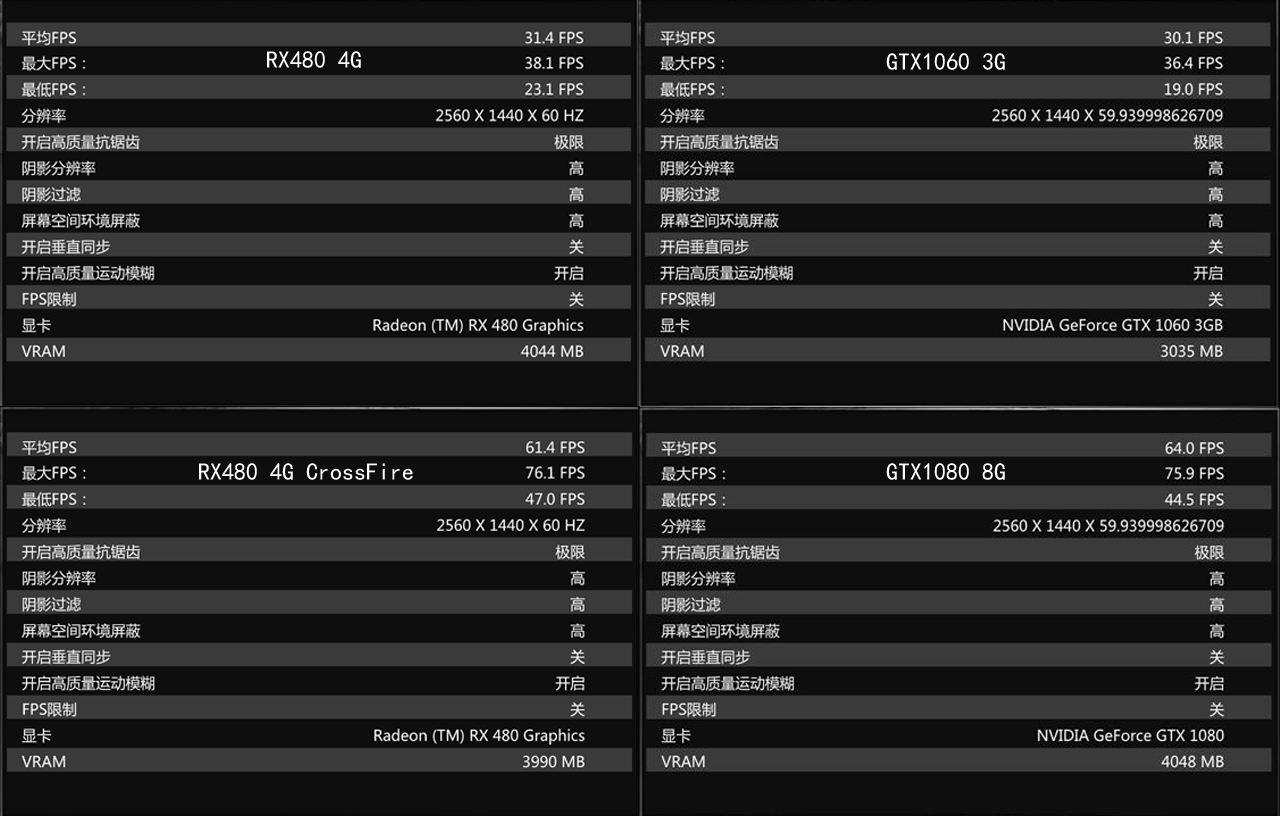 1440P分辨率下,单卡RX480 4G小胜GTX1060 3G,双卡RX480 4G也小胜GTX1080 8G