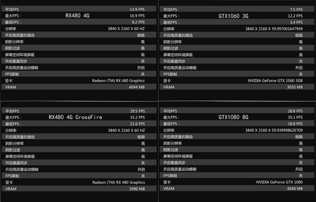 2160P分辨率下,GTX1060 3G爆显存,所以RX480大胜(不过都属于无法流畅运行),双卡RX480 4G则小胜GTX1080 8G