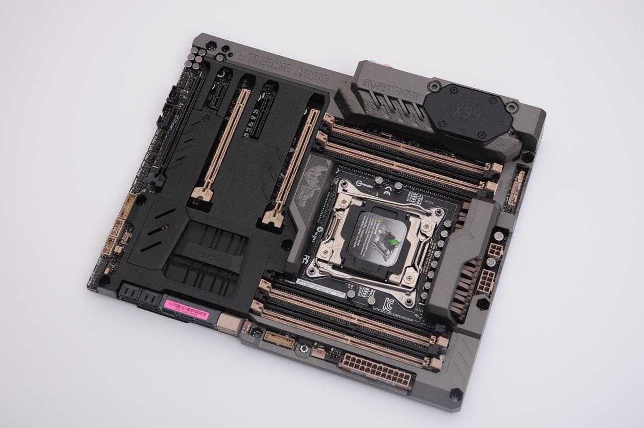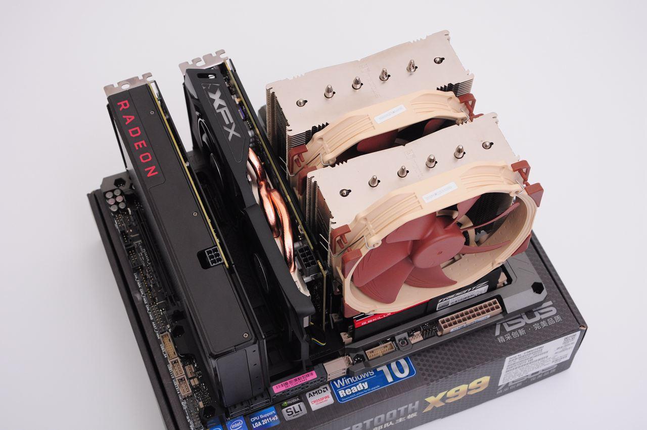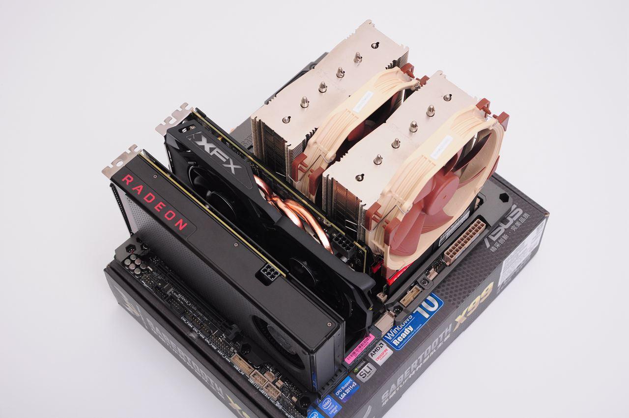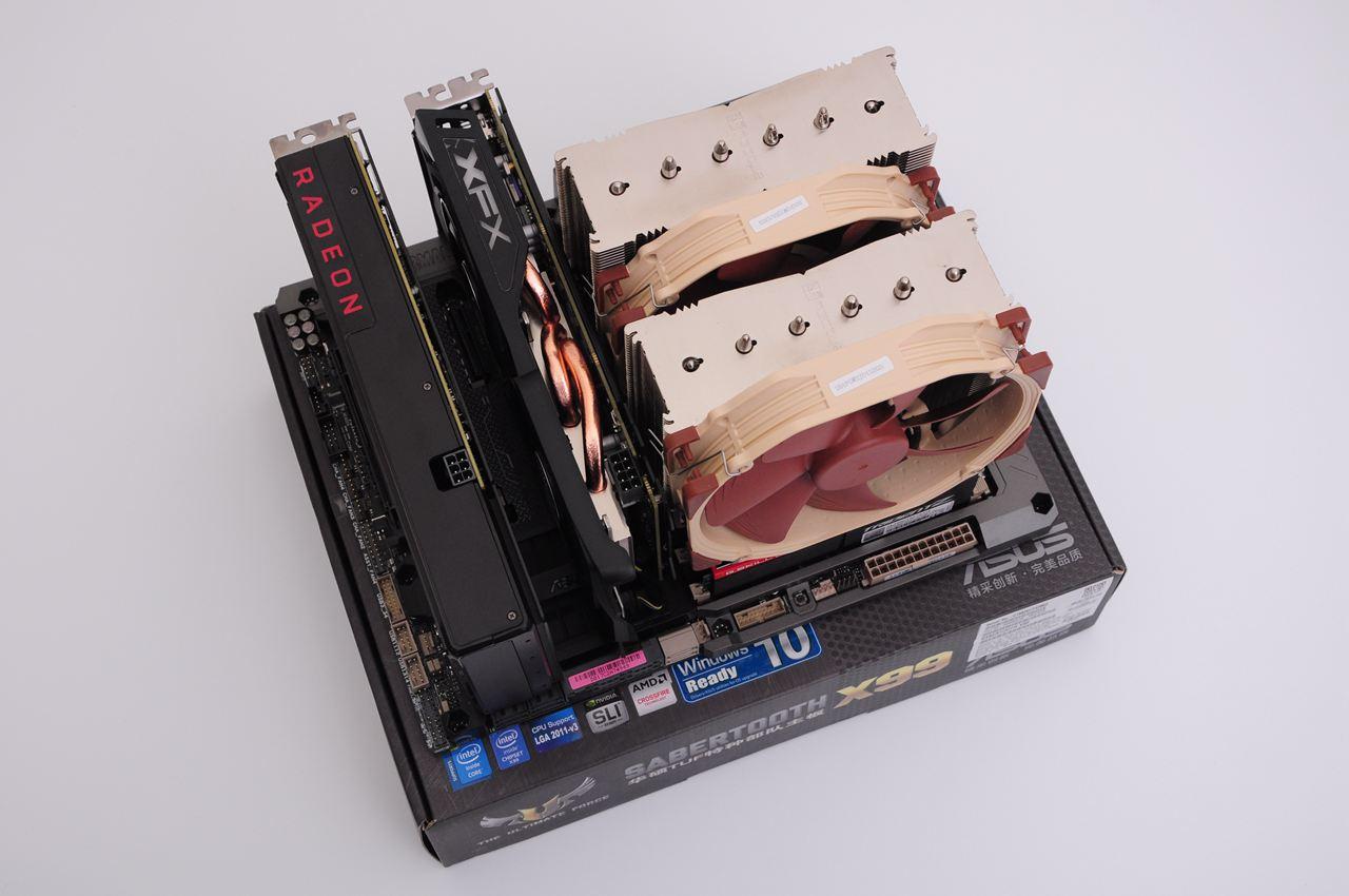刚开始用Z170-AR测试交火,没想到折腾过程中,板子被散热器给压坏了(散热器扣具压力太大,4层PCB不经用啊),一怒之下,翻出压箱底的华硕X99剑齿虎,8层板+一身铠甲,我让你散热器再给我压!