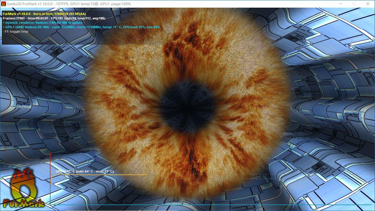 先看Furmark烤机测试,RX480通过5分钟烤机后,温度稳定在73℃,此时室温为23.8摄氏度。