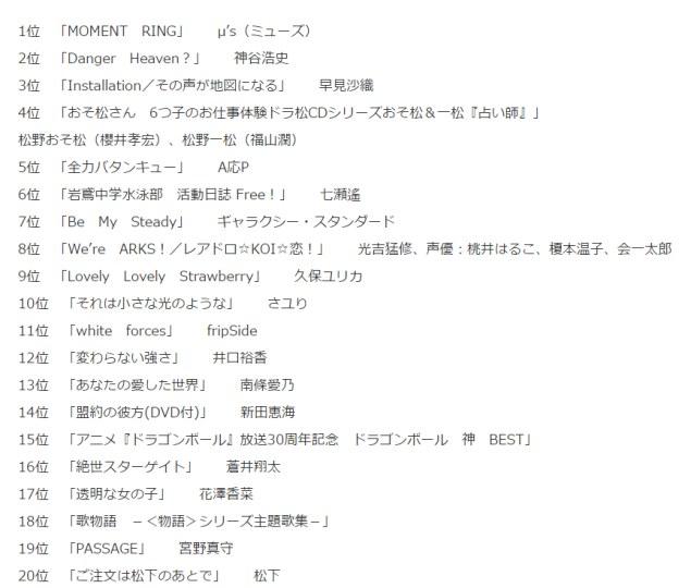第1位《MOMENTRING》μ’s 第2位《DangerHeaven?》神谷浩史 第3位《Installation/その声が地図になる》早见沙织 第4位《阿松六胞胎的工作体验广播松CD系列 阿松&一松“占卜师”》 松野阿松(樱井孝宏)、松野一松(福山润) 第5位《全力バタンキュー》A应P 第6位《岩鹫中学水泳部活动日志 Free!》七濑遥 第7位《BeMySteady》ギャラクシー·スタンダード 第8位《We’reARKS!/レアドロ☆KOI☆恋!》光吉猛修、声优:桃井晴子、榎本温子、会一太郎 第9位《LovelyLovelyStrawberry》久保由利香 第10位《それは小さな光のような》さユり 第11位《whiteforces》fripSide 第12位《変わらない強さ》井口裕香 第13位《あなたの愛した世界》南条爱乃 第14位《盟約の彼方(DVD付)》新田惠海 第15位《动画龙珠3030周年纪念龙珠神BEST》 第16位《絶世スターゲイト》苍井翔太 第17位《透明な女の子》花泽香菜 第18位《歌物語-物语系列主题曲集-》 第19位《PASSAGE》宫野真守 第20位《ご注文は松下のあとで》松下