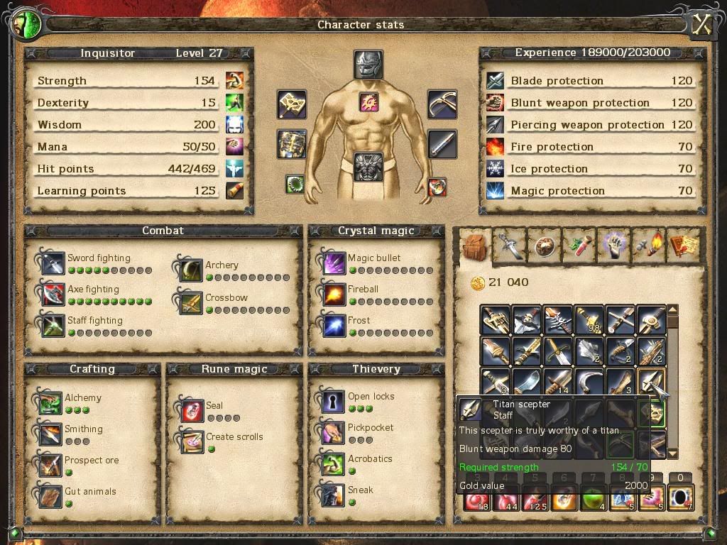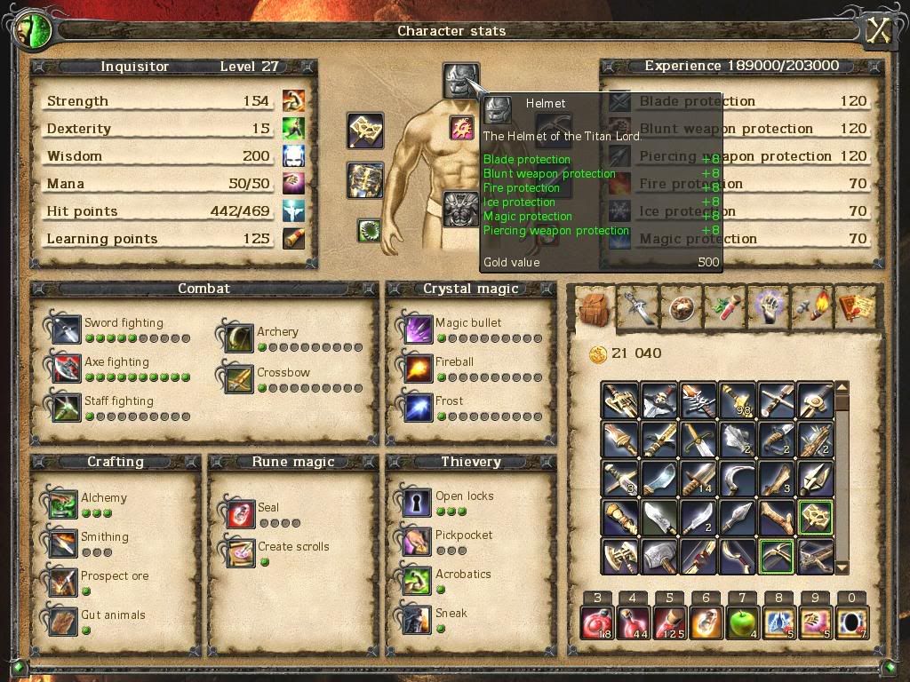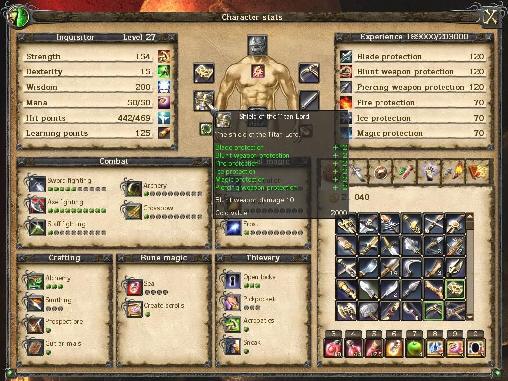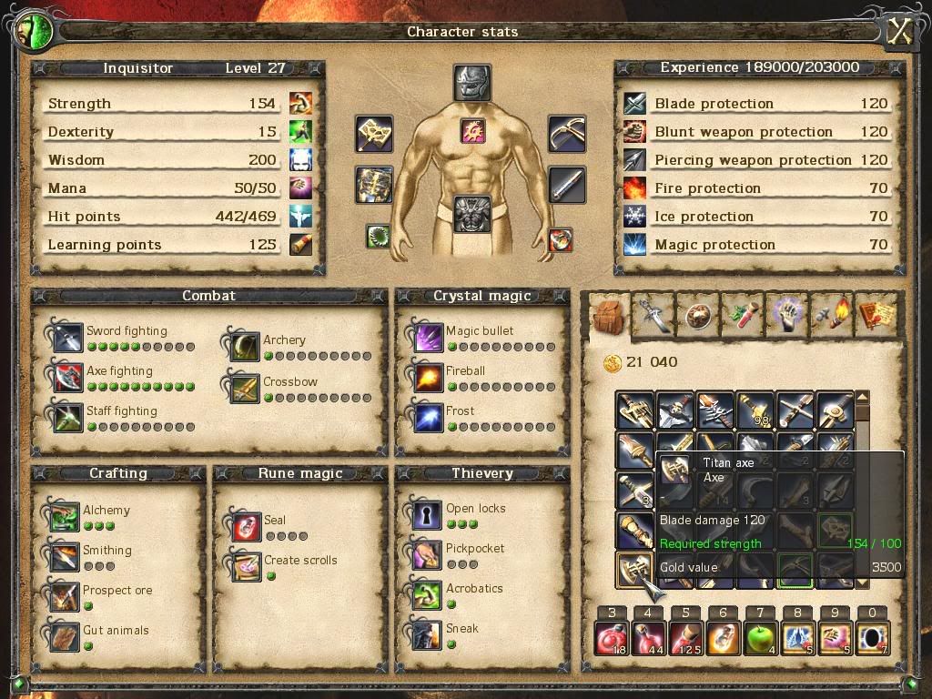 最开始我发现SoulDrinker和Stormwind的时候我也以为捡到宝贝了,实际上这两样东西很鸡肋............如果你跳过剧情去找剑,看剑的怪你未必弄的过,不跳过顺着剧情走,等剑重铸好以后已经是废铁了,这两个东西很鸡肋,至于Hornbow,和那个猎人对话,他会要你跟他去东北的遗迹杀一个传说级食人魔(接了这任务之后和他分开,自己去干掉食人魔的话会拿个称号:Dead of legend),然后去和他对话,他就会把弓给你了.这个游戏,我觉的近战是做的最好的,法系的伤害虽然高,但是限制太大(对面的只要一近身基本就玩完了,非常不适合后期墓穴探索的遭遇战.)剑的连击并不是狂点鼠标就好的,是要节奏的,节奏把握好了就是一气呵成的连下来,对手连还手的机会都没有,到7级出了蓄力攻击之后更是接近无敌了,习惯了之后同时面对4-5个Lizard Warrior一点压力都没有,完全可以无伤(不信的话请看我图里那53把剑,我已经卖出去200多把了.)对付像野猪还有Ashbeast这样攻击性极强的野生动物,要么是躲开它第一击然后从侧面砍几刀,要么就趁它招都没放出来,一气呵成连到死.