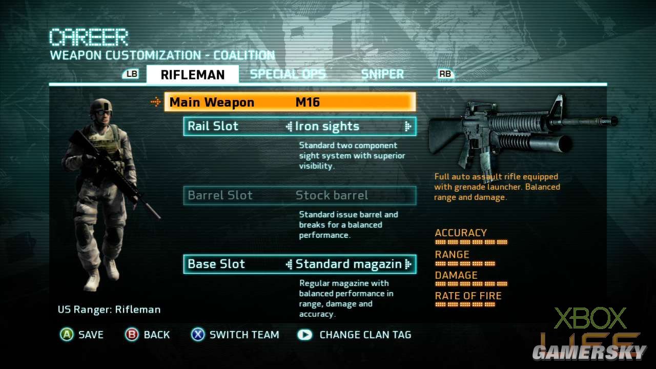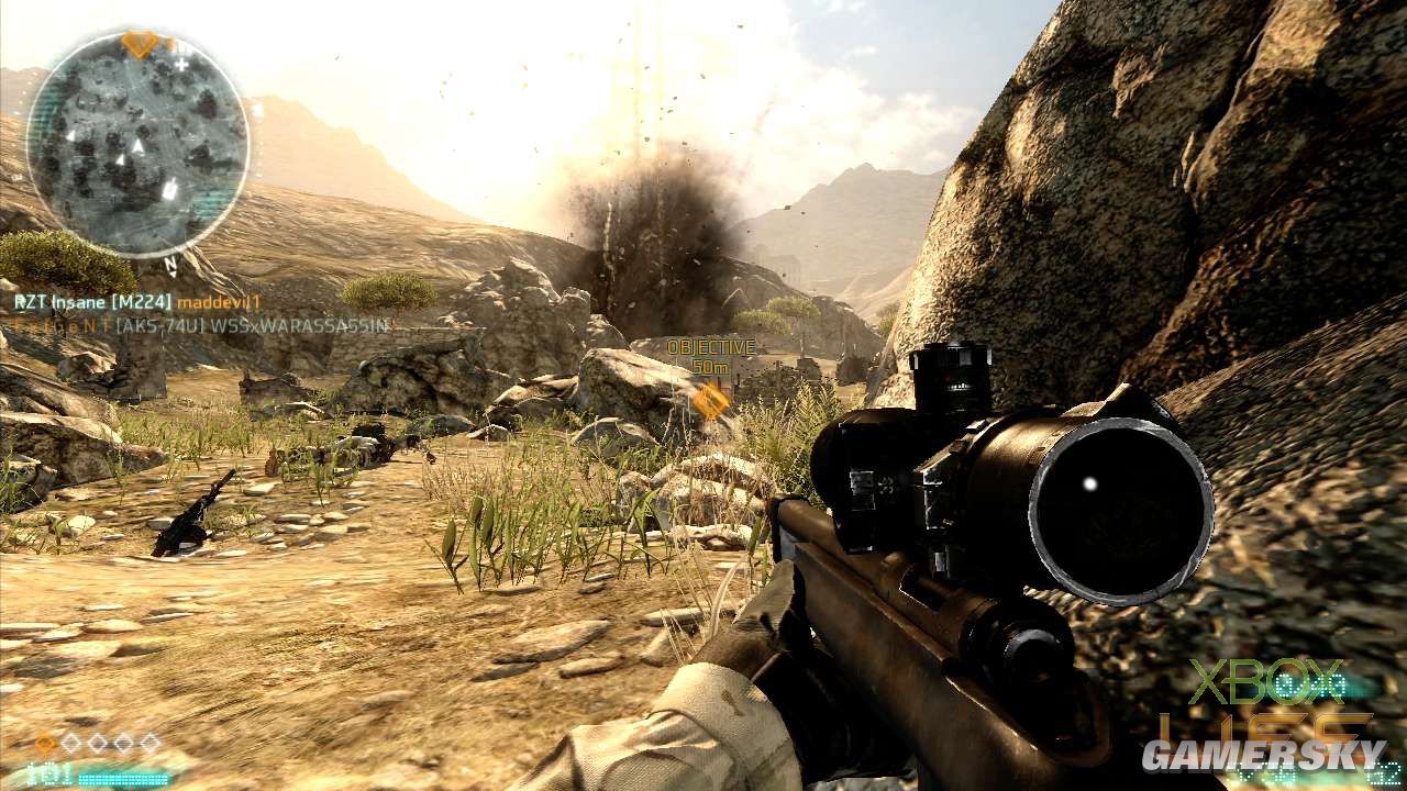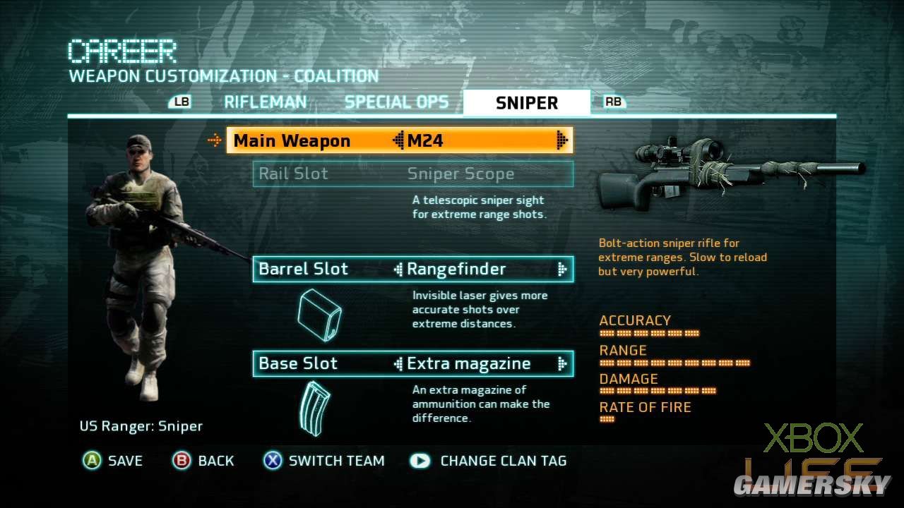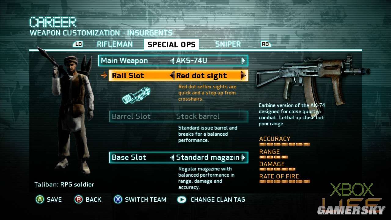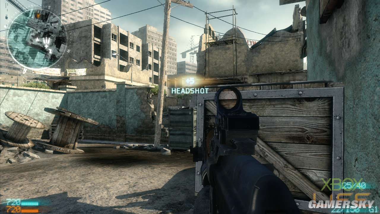 Team Assault的玩法就是玩家耳熟能详的团队厮杀模式,攻/守节奏相当快,只要一方率先取得1200分的杀敌分数便能获得胜利并结束游戏。这张地图混合了巷战、对峙持久战、中距离狙击战的玩法,除了要发挥团队合作的精神,个人的杀敌能力也是赢得胜利的要素之一。值得一提的是,这个模式杀死敌人的计算方式,类似《使命召唤》的多人连线对战,杀一名敌人可获得十分,如果是爆头或达成其他条件的话还可获得额外的五分。 接下来介绍武器的部份,游戏提供玩家Rifleman、Special Ops、Sniper三个兵种,每个兵种所携带的武器与手榴弹/爆破性武器都不同,玩家如果想解开更多新的装备,就得使用该兵种进行杀敌升级。