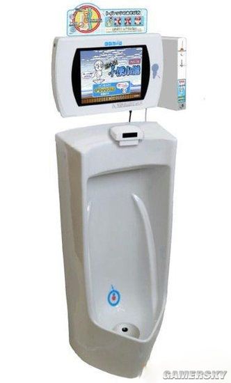 看上图的尿斗是不是有点奇怪?这其实是世嘉的一款猥琐与基情并存的尿控电玩,游戏时需要一个厕所,一个计量器和一个颇有液体存货的男人。以下是这款游戏里面的四种玩法
