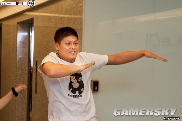 假的达斯魔登场之后,似乎吸引到其他编辑的出现,大家开始纷纷加入游戏的行列。拿光剑来玩《Kinect星球大战》是真的蛮有趣的,很能融入游戏中的情节,但是因为我们拿的光剑太长,空间有点拥挤,所以很容易会打到旁边的人,你看左边的相机编辑吉姆林的表情就知道他很怕被打到!